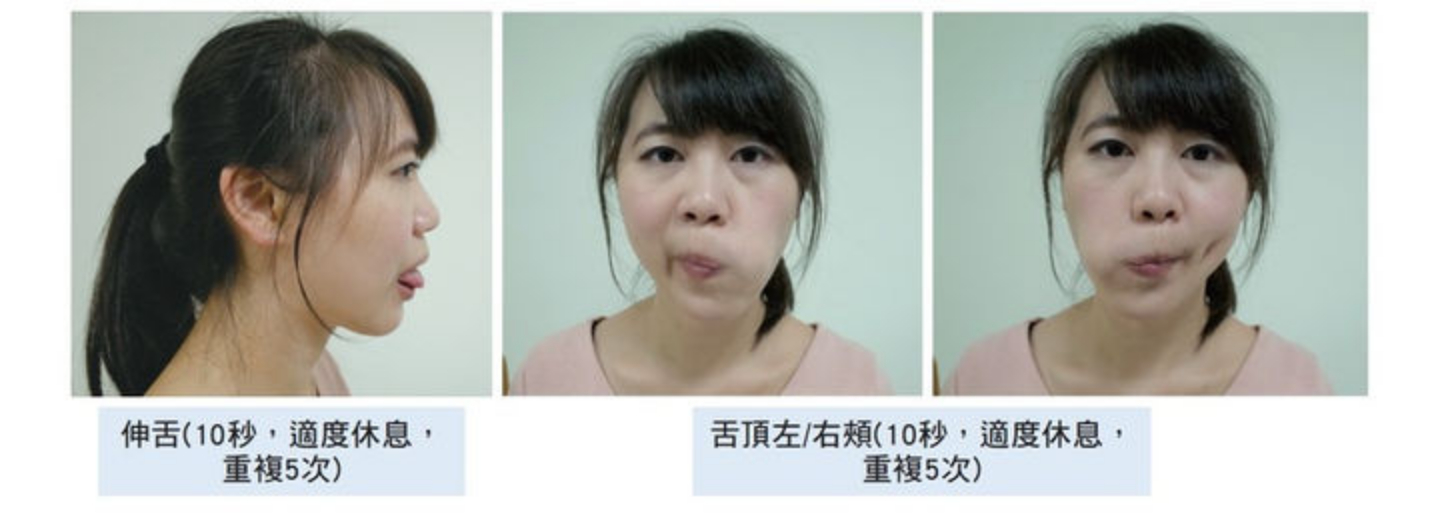 c. 舌部運動:舌頭前伸、縮回、抬高頂上顎、向上捲、推兩側臉頰、做清潔牙齒動作。練習發音,如ㄉ、ㄊ、ㄐ、ㄑ、ㄒ等音。