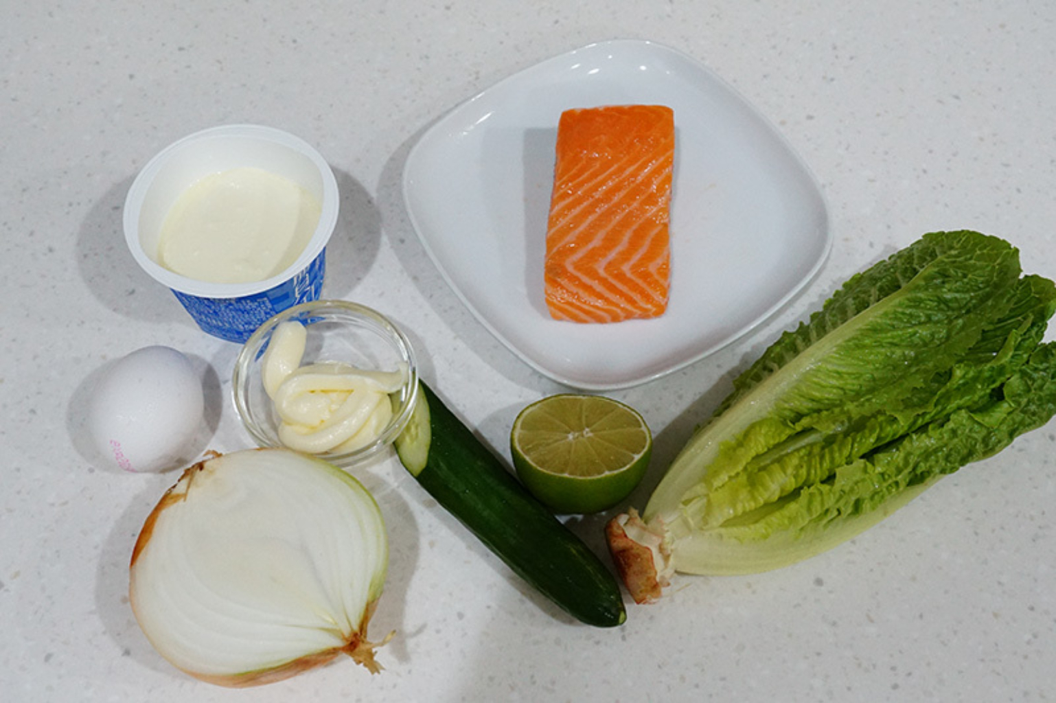 最後來做一些擺盤,將羅蔓葉洗乾淨切小片鋪底,放上鮭魚並淋上塔塔醬就完成啦!