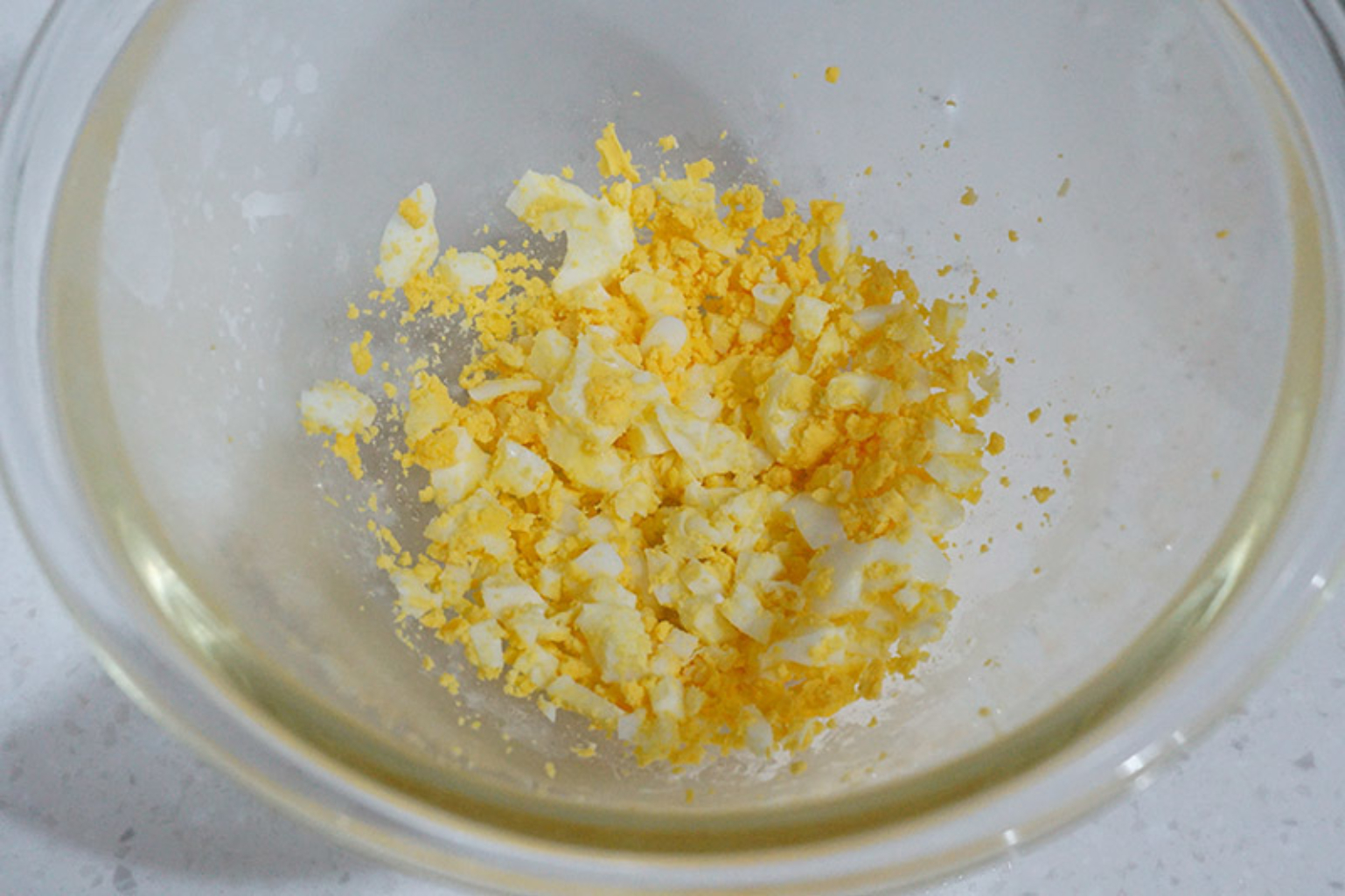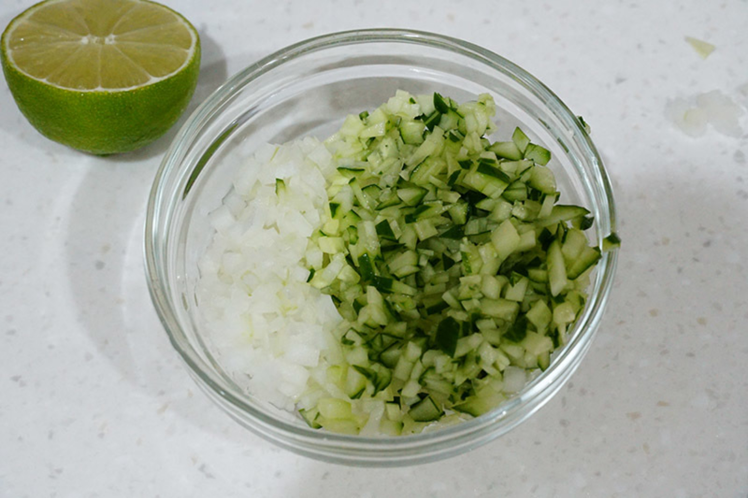 等待煮蛋的同時,將洋蔥跟小黃瓜切小丁,切越細越好。加入檸檬汁、鹽巴少許跟白醋1大匙,混合均勻醃漬入味。