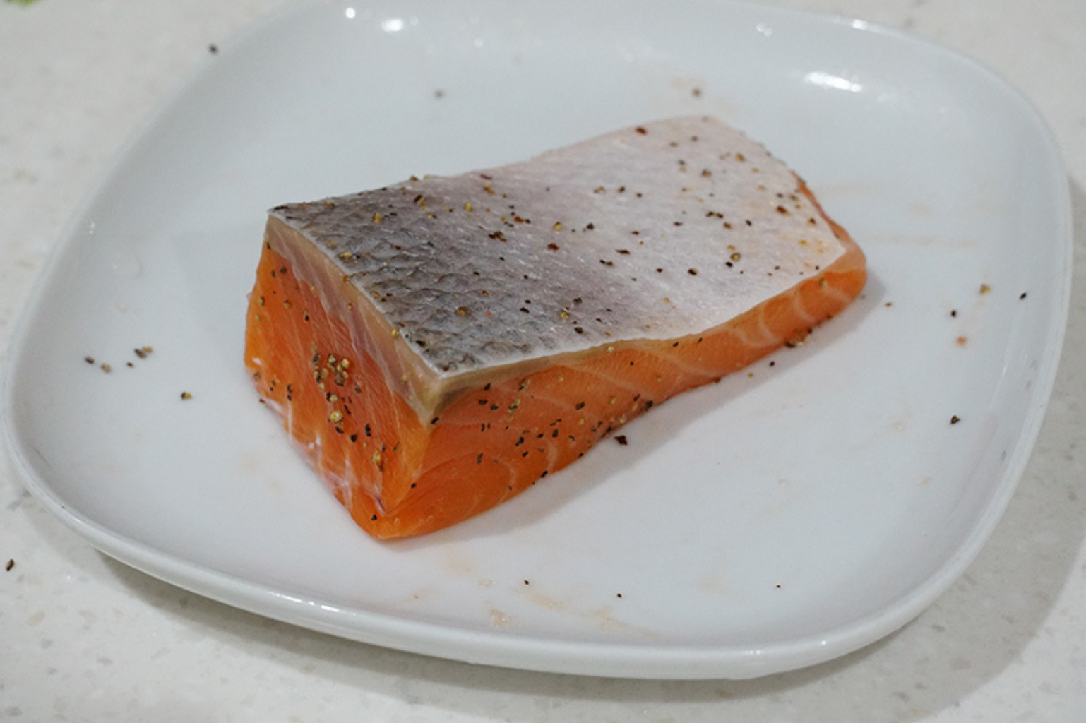 鮭魚的部分,先用鹽巴跟胡椒在表面調味。