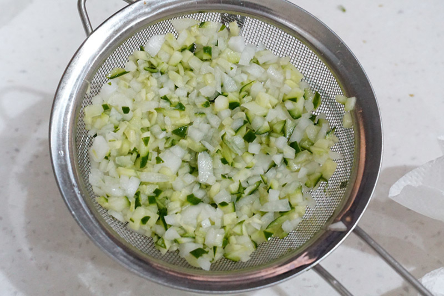 接著處理塔塔醬。將剛剛的鹽漬小黃瓜跟洋蔥瀝乾,因為除了檸檬吃,加入鹽巴也會讓小黃瓜跟洋蔥釋放很多水分。可以取一張紙巾蓋上在用手擠壓一下,充分把水分擠出。