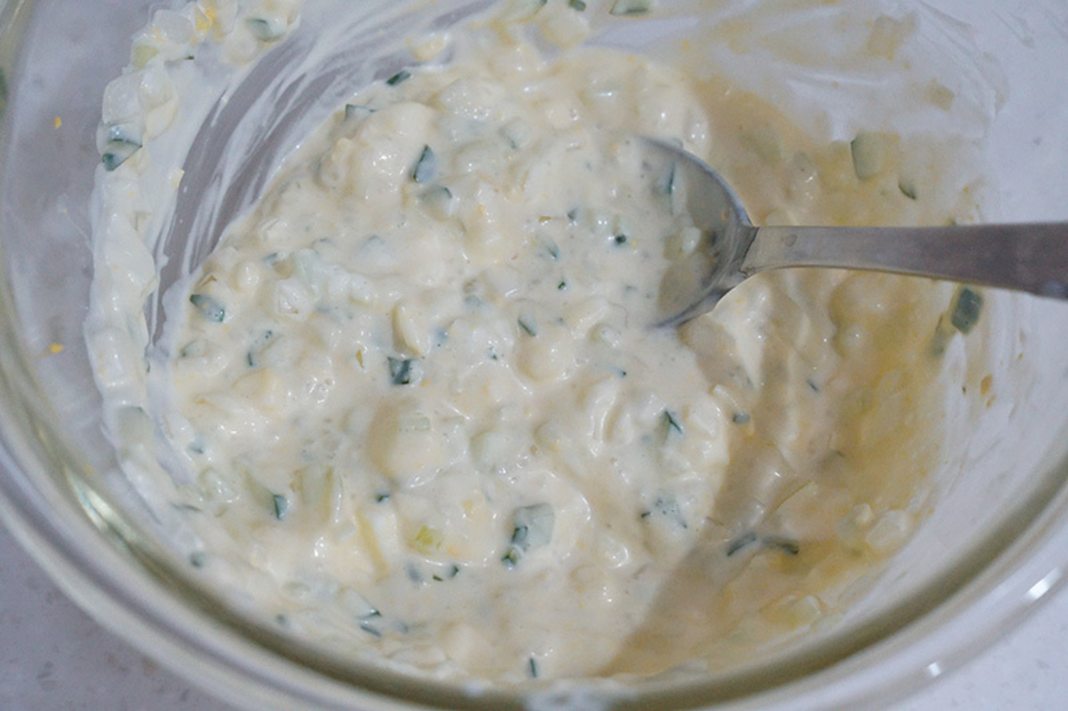 再混入小黃瓜洋蔥混合食材,再加入優格與美乃滋。將全部的東西混合均勻,就完成塔塔醬了!