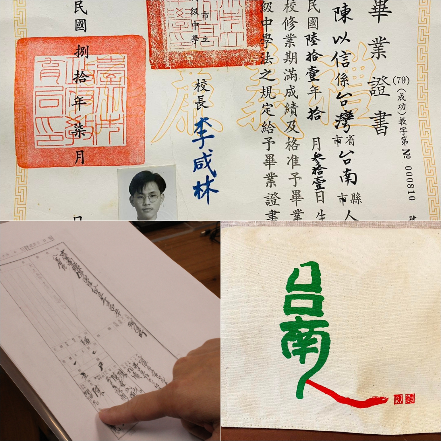 陳以信於1972年出生,現年49歲,在同黨參選人中最為年輕。他表示,自己祖籍台南,高祖父陳乞那一代就在台南落地生根,還翻出戶籍資料、畢業證書,說明與台南的淵源,並以台語強調:「台南就是我的根」。