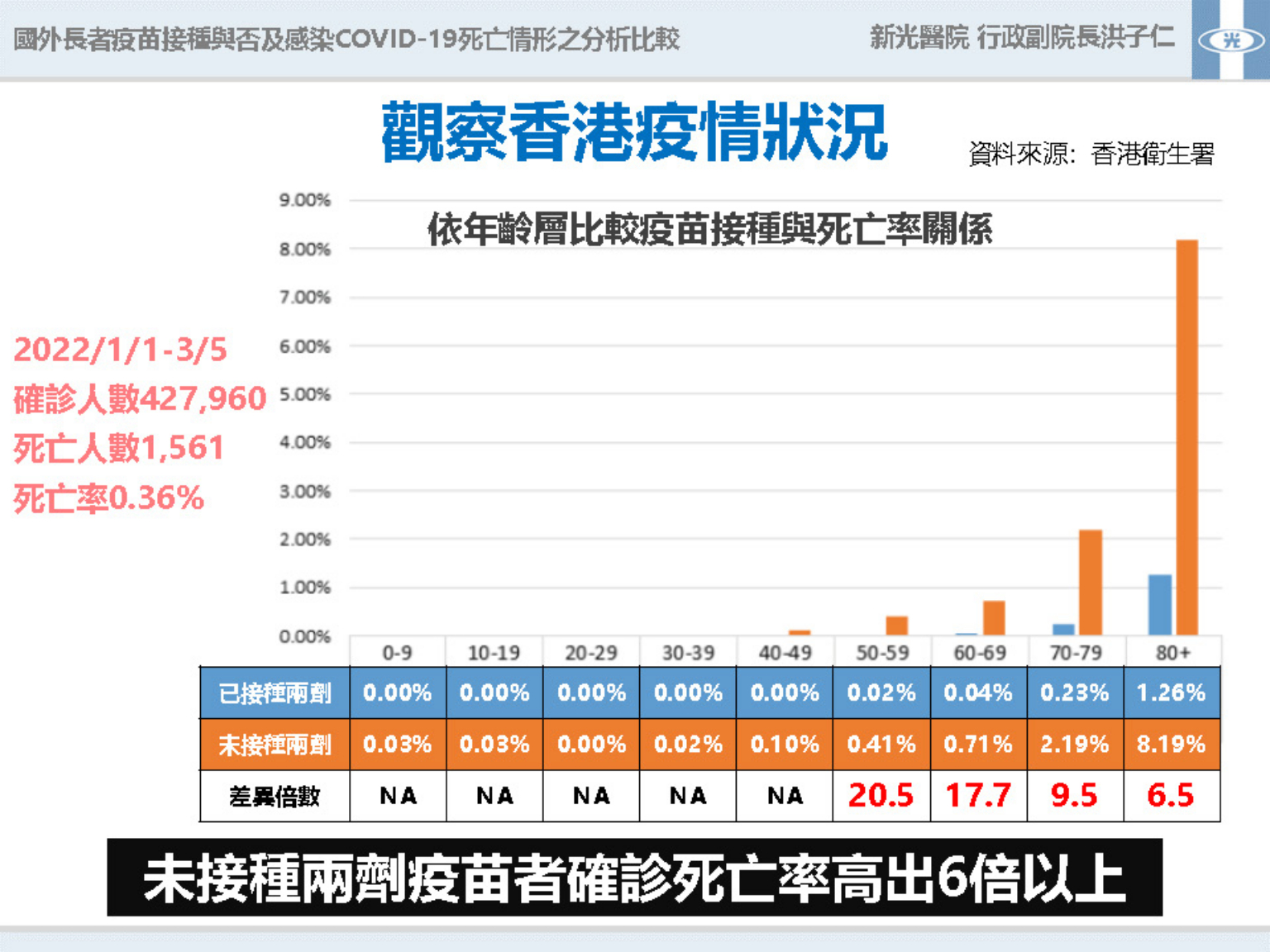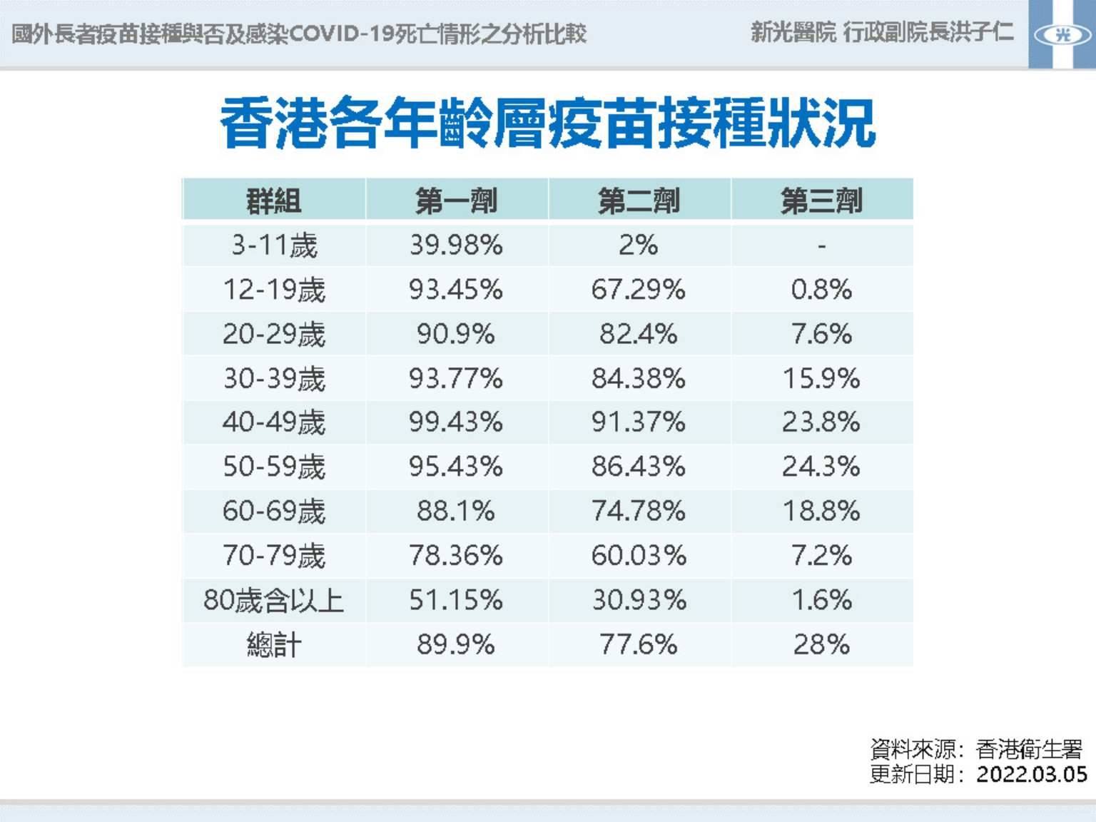 新光醫院副院長洪子仁,也在今日疫情記者會中提到,香港許多長者1劑疫苗都沒施打,所以確診重症住院比例偏高,導致醫療量能被突破,並呼籲要提升國內長者疫苗覆蓋率,在病毒進入社區傳播時,才可將對醫療量能影響降到最小。