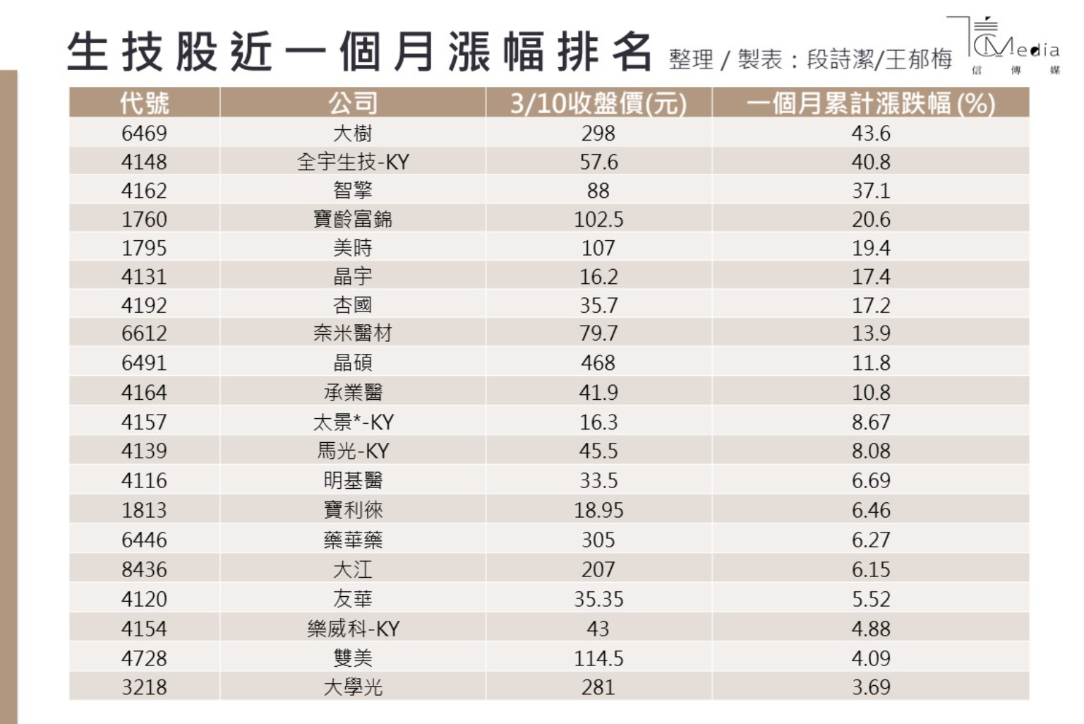 近期生技股熱鬧滾滾,盤點近一個月生技股漲幅,大樹藥局榮登第一上漲43.6%,全宇生技-KY上漲40.8%,智擎上漲37.1%,寶齡富錦上漲20.6%,美時上漲19.4%,幅度都不小。