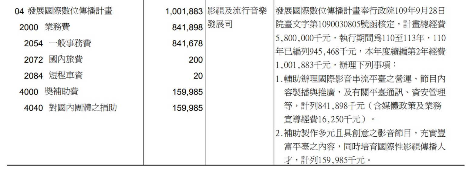 此外,包含TaiwanPlus在內的「發展國際數位傳播計畫」期程四年,經費共編列58億元,每年都要撥出10億經費,下載情況卻不如預期。立委高虹安質疑,TaiwanPlus預期受眾是面向全球、介紹台灣文化,應以外國人為主,直言「非常糟糕,缺乏全球在地化精神」,下週將邀請文化部到立法院備詢。
