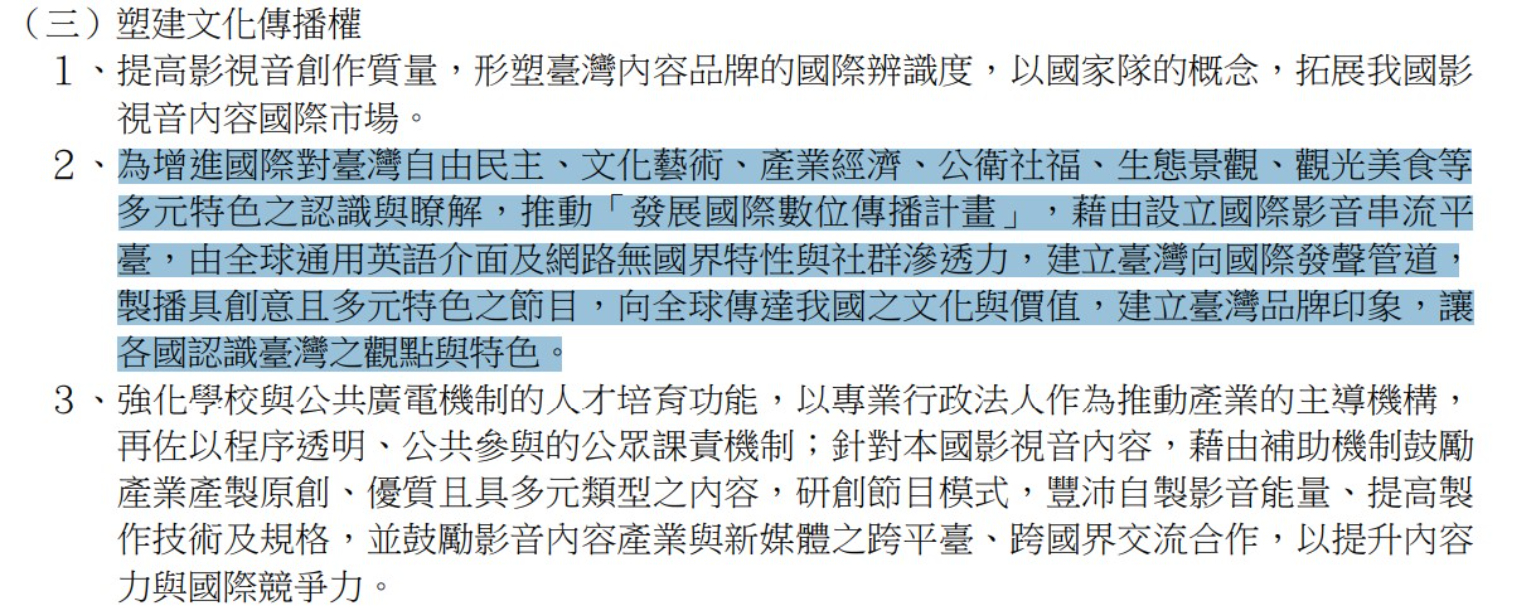 國際影音串流平台TaiwanPlus於2021年8月30日正式上線,為一項2021年至2024年的四年計劃,編列計劃預算總額約58億元,其中每年約撥10億元經費。其實TaiwanPlus成立過程中已是一波三折,起初由文化部委託公視主辦,但卻遭外界質疑公權力介入公視的獨立性,公視更有三位高層為此閃辭。後來計劃轉由中央社接手,執行長由蔡秋安擔任,終於順利成立。