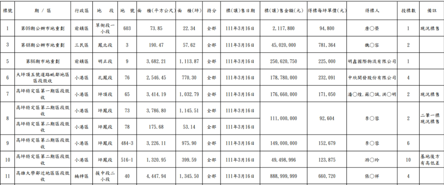 值得注意的是,這次土地標售以自然人身分的買家較為積極出手購地,這次9個標號脫標的土地當中,僅有第5標、第6標是以法人公司名義購入,分別是明鑫物流、中鋼子公司中欣開發,其餘皆是自然人名義。