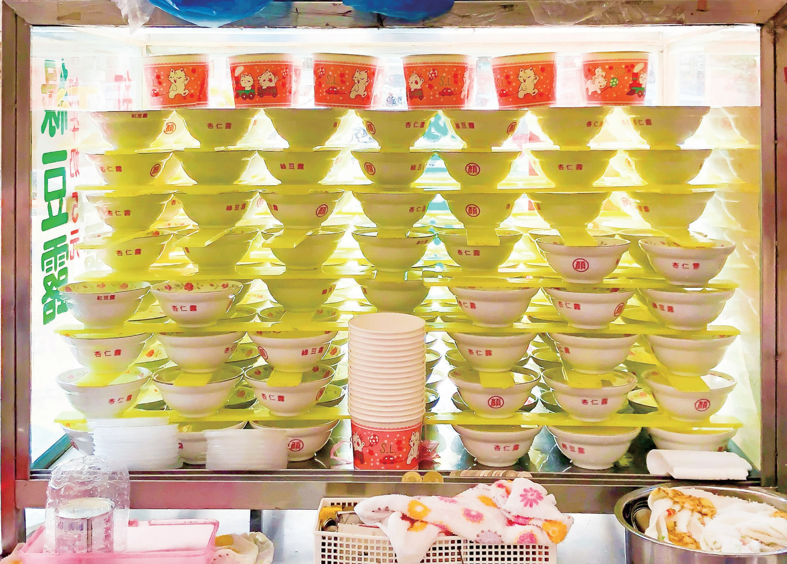 杏仁露,依照字面意思,應該是杏仁的液體製品,但顏記杏仁露賣的卻是彈牙的杏仁豆腐,不賣杏仁茶。在永樂市場擺攤超過三十年的顏記杏仁露,小小的攤車層層疊疊,擺滿了裝著杏仁跟洋菜凍的冰涼古樸土瓷碗。保持傳統的涼水攤,在熱鬧的街市中反而特別明顯。