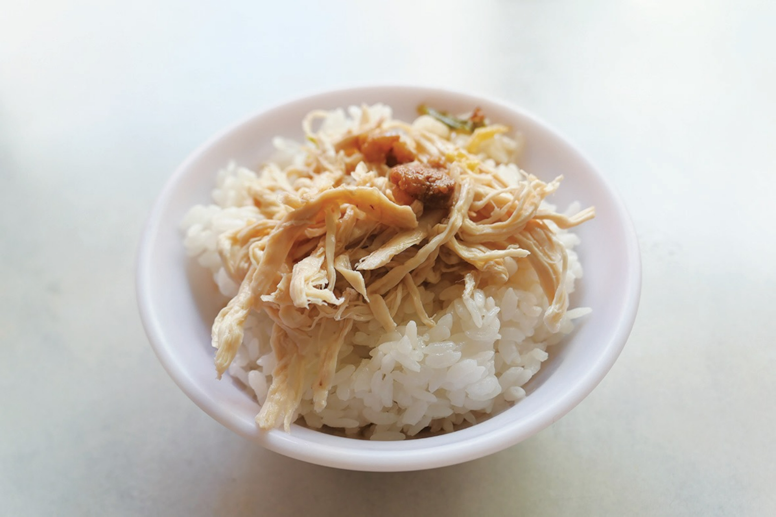 五郎套餐包括一碗雞肉飯跟配菜盤,雞肉飯的雞肉絲有一點乾,飯上澆淋的湯汁頗多,雞肉味清爽鹹香,配上微乾的雞肉絲,反而有種微妙的平衡,每顆米粒都裹上飄著雞油香氣的滷雞肉湯汁,要吃快一點,否則米粒被泡到軟黏,那就不是雞肉飯了。