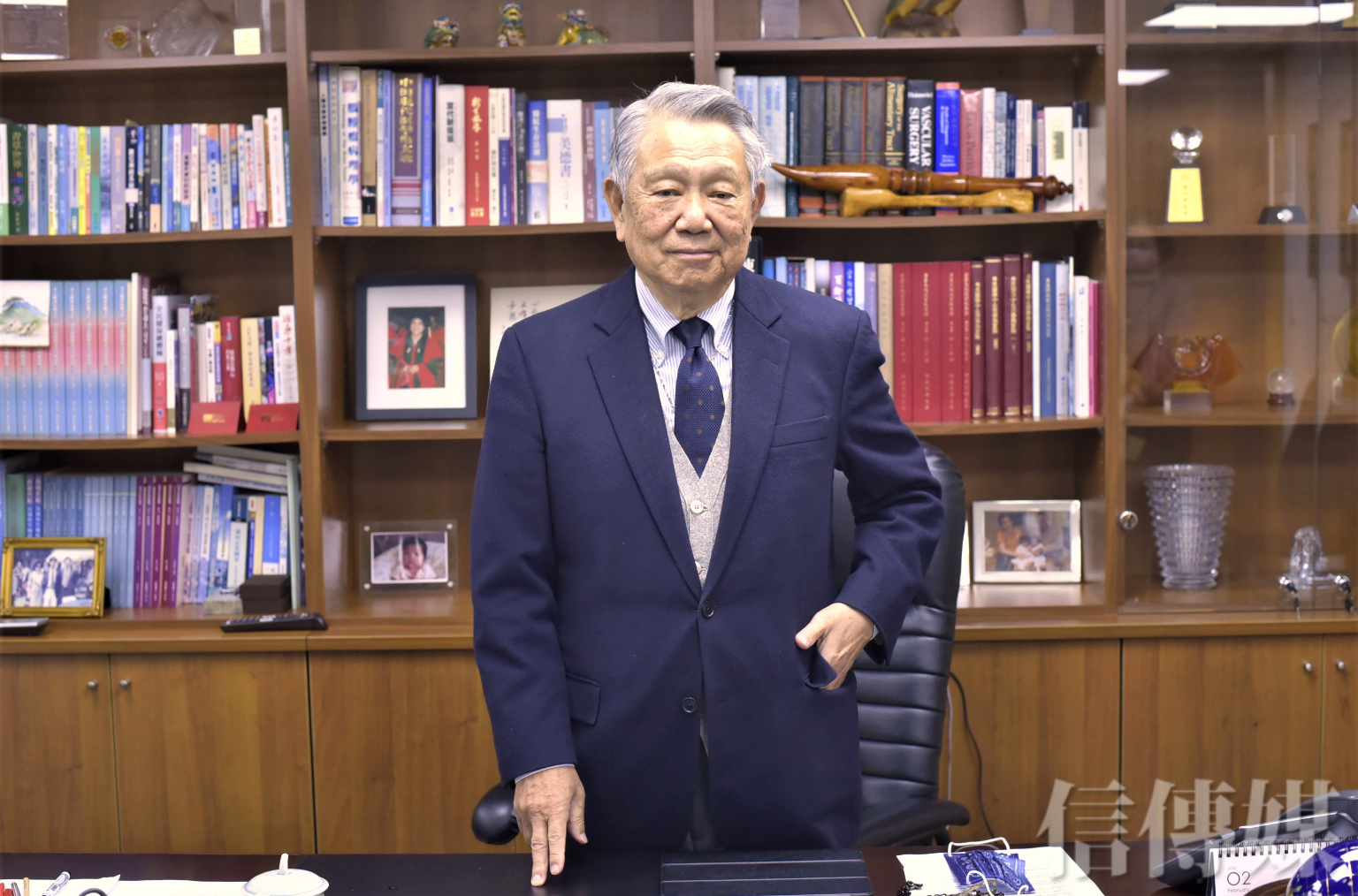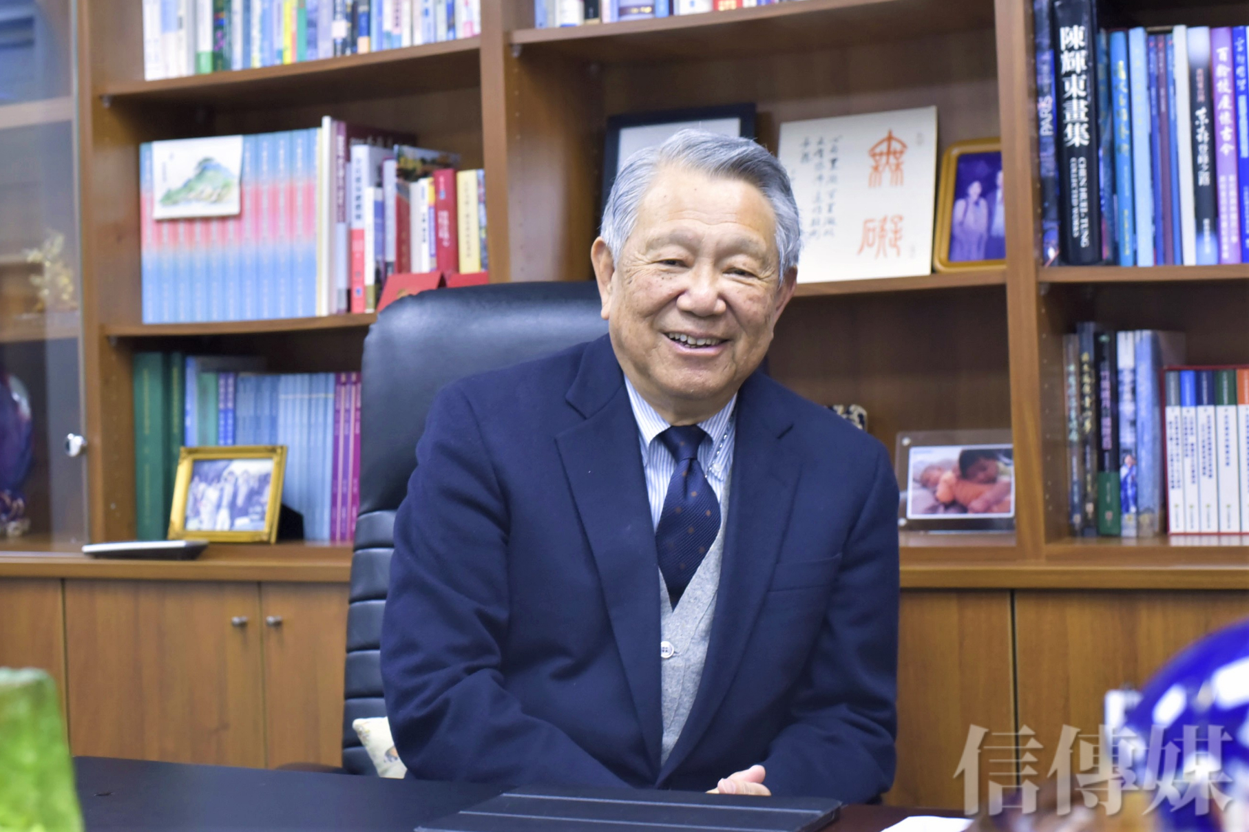 辦公室書櫃上擺滿妻小、孫子的照片,還有幾幅大師的書法水墨字畫,「我以前自己也有寫一些,最近比較沒有寫了。」
