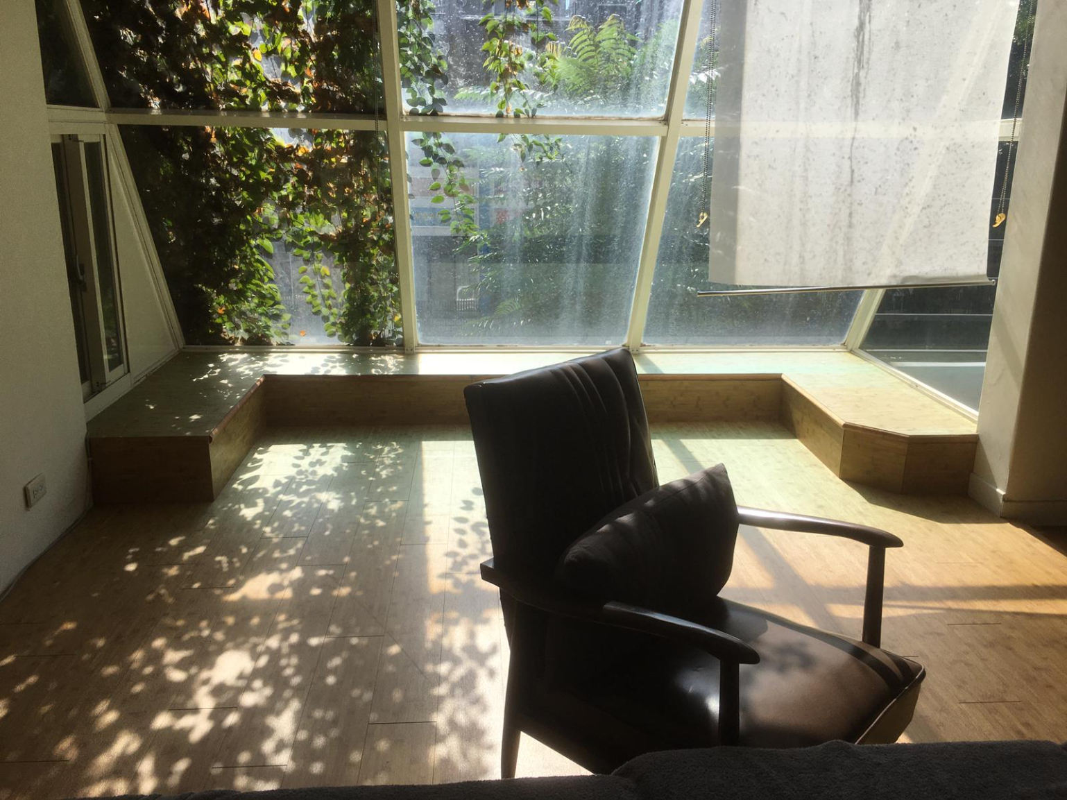 我本來就愛撿老東西,喜歡有歲月痕跡的事物,覺得老房子有一種很濃郁的情感。這屋子原本租給水電行,外觀被鐵皮包覆,像個鐵甲武士。拆掉鐵皮後,只是油漆粉刷,我請園藝把庭院鋪上的水泥地挖掉,復原種樹。二樓原本有三個房間,打掉牆面,卻留下門框;因為門上方有鑲嵌玻璃和百頁的氣窗,很有味道。
