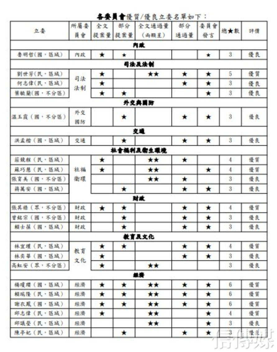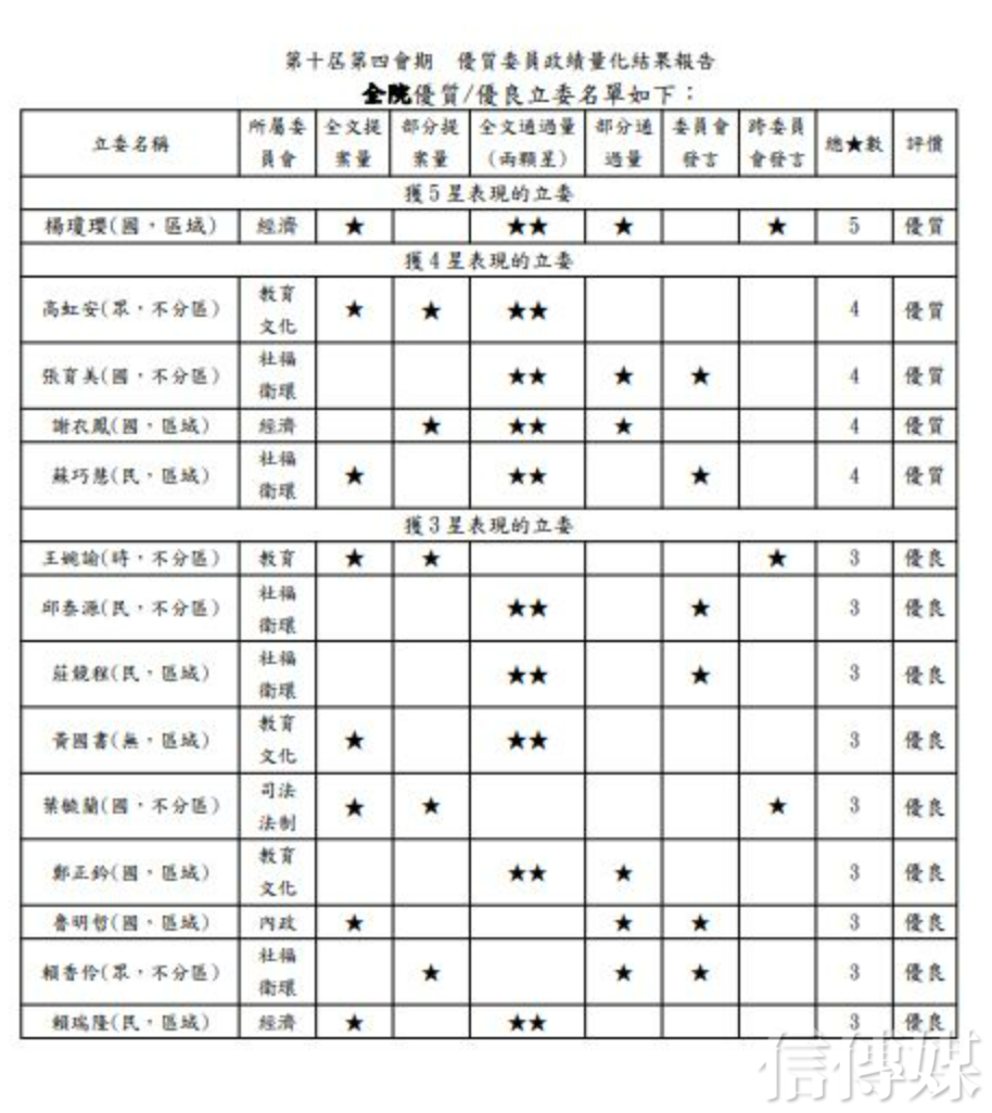 口袋國會今(18)日發布立法院第10屆第4會期國會評鑑結果,其中共有14位被評選為全院表現優良以上立委,國民黨6位、民進黨4位、民眾黨2位及、時代力量籍無黨籍各1位;各委員會評比共有22位立委為優良,國民黨11位、民進黨9位及民眾黨2位。同時獲得全院及委員會表現優良立委共有9位,更以國民黨楊瓊瓔獲得5星跟6星分數最為突出。