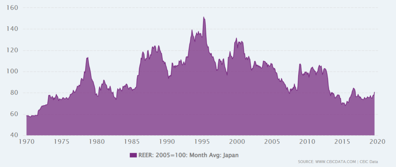 這裡我們最好訴諸巴拉薩─山謬爾森假設(Balassa-Samuelson),它通常被視為最適合解釋REER運動的理論框架。該理論主張在某些假設下,當某國可貿易部門的生產力成長得比不可貿易部門要快得多,且這項差距比該國其他貿易夥伴要來得高,無論該國採取的是固定或浮動匯率,其REER將會升值。這解釋了日圓REER何以在1960年代大幅上升,並於1995年4月達到峰值。