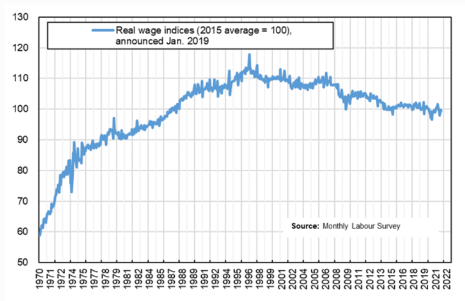 日本製造業的生產力出現停滯並不令人意外,過去20年來實質薪資也因此微幅衰退,實質薪資指數(2015=100)從1970年的60左右升至1997年的113,接著於2021年降至100,導致民眾購買力減少。