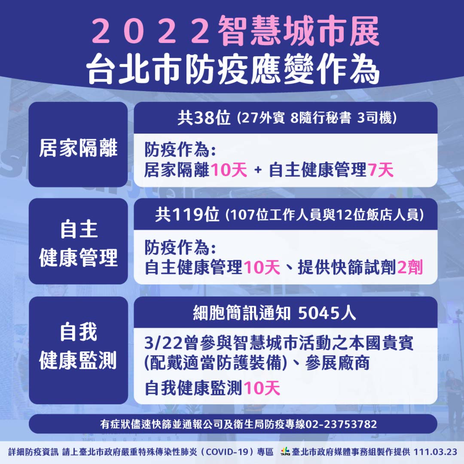 除確診3人外,其餘未染疫27位外賓昨分乘3輛巴士前往飯店,現已匡列密切接觸者38人須居家隔離,包含27名外賓、8名隨行秘書和3名司機;相關人員119人自我健康管理並發放2劑快篩試劑。參展廠商和貴賓一共5045人,北市府也會發送細胞簡訊要求自主健康監測。