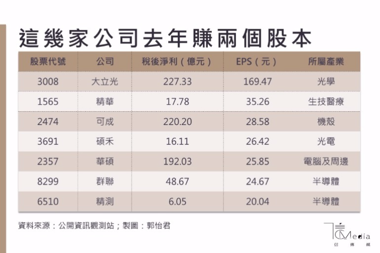 根據公開資訊觀測站資料,去年上市櫃公司中,半導體產業還是含金量相對高的族群,去年賺進一個股本的公司最多,除了光台積電全年大賺3000多億元,已經稱霸台股,其他還包括矽力杰、聯發科、精測、譜瑞、信譁、昂寶、宏觀微等公司,去年都賺到一個資本額以上。