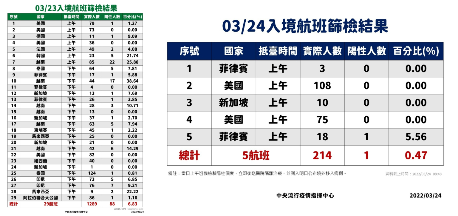 指揮中心說明,今日新增境外移入個案為59例男性、65例女性,年齡介於未滿5歲至60多歲,分別自越南(49例)、印尼(9例)、韓國(6例)、香港(5例)、泰國(4例)、緬甸(3例)、馬來西亞、法國、菲律賓及美國(各2例)、德國、柬埔寨、英國、日本、澳大利亞、馬爾他及義大利(各1例)移入,另33例調查中。入境日介於今(2022)年2月20日至3月23日。