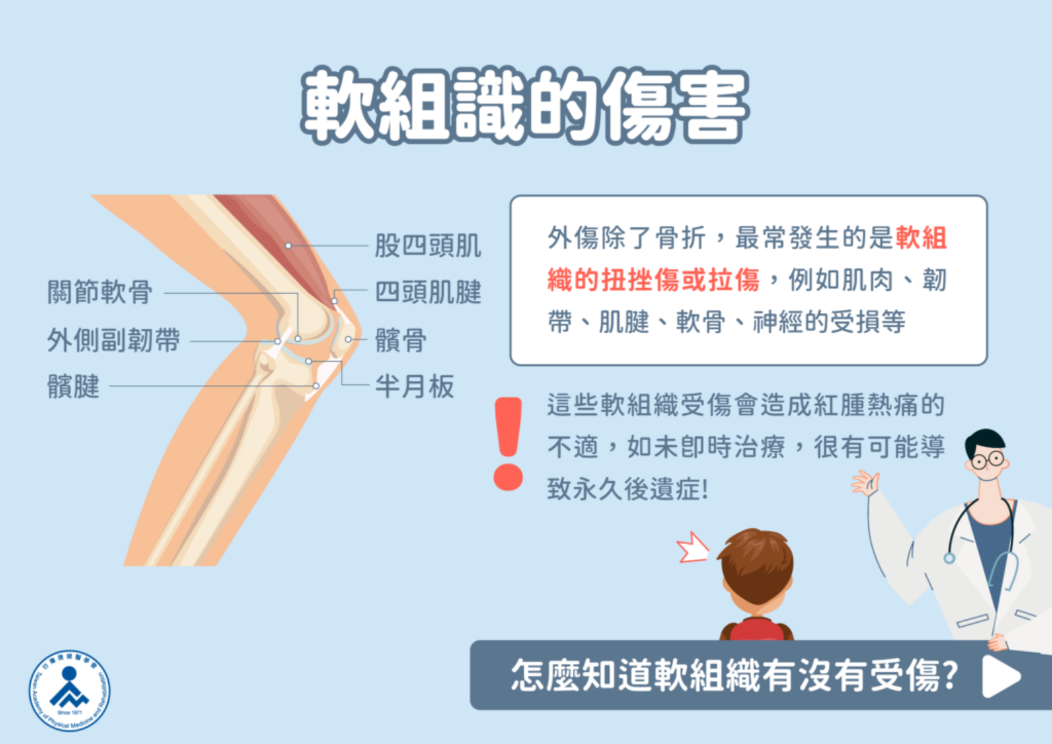 即使骨頭沒事,光是軟組織的問題也會造成紅腫熱痛和極大的不適,沒有好好治療,甚至導致永久後遺症。