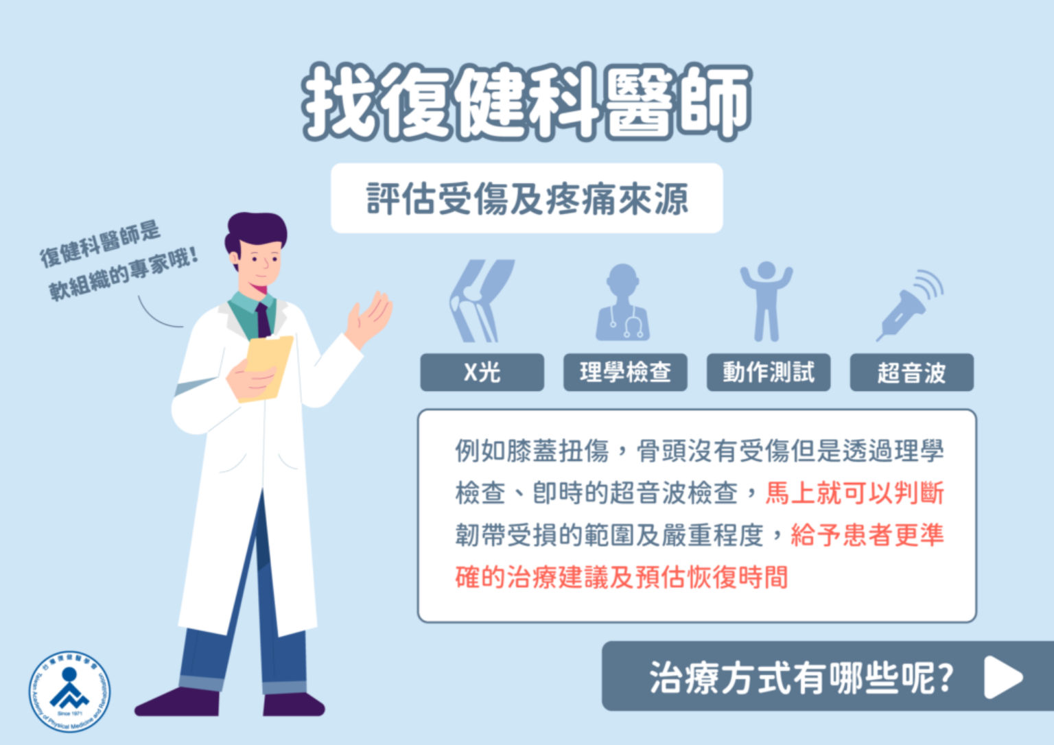 復健科醫師是軟組織的專家,可以幫忙評估受傷及疼痛的來源。