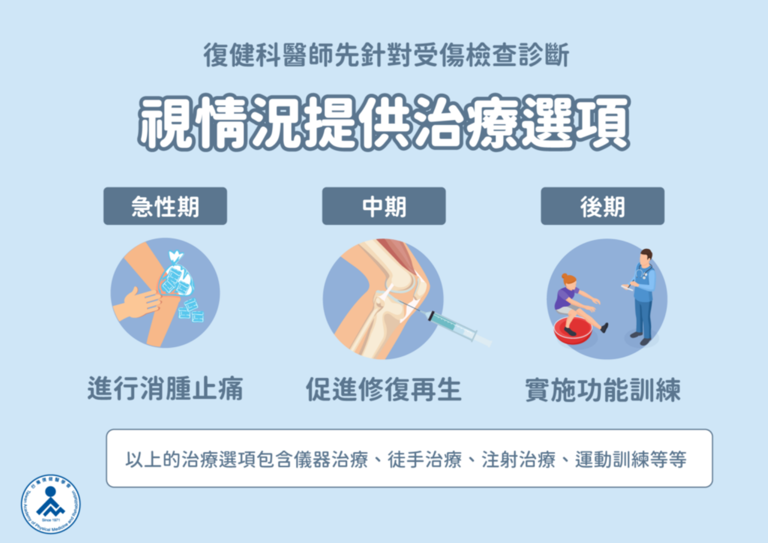 治療方面,除了止痛藥物,復健科醫師可以根據受傷的組織特性及受損程度,提供患者不同種類的治療選項,例如注射治療、儀器治療、徒手治療、運動訓練等等。