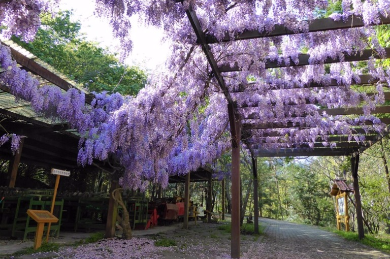 櫻花不再是春季一枝獨秀的焦點!在春暖花開的四月天,百花爭妍的景象隨之到來,紫藤花如紫色瀑布垂掛,自支架上傾瀉而下,一串串橫溢於武陵國家森林遊樂區武陵山莊前庭走廊花架間,醉人的紫藤花香讓遊客著迷,為武陵山上增添一抹異色風光。