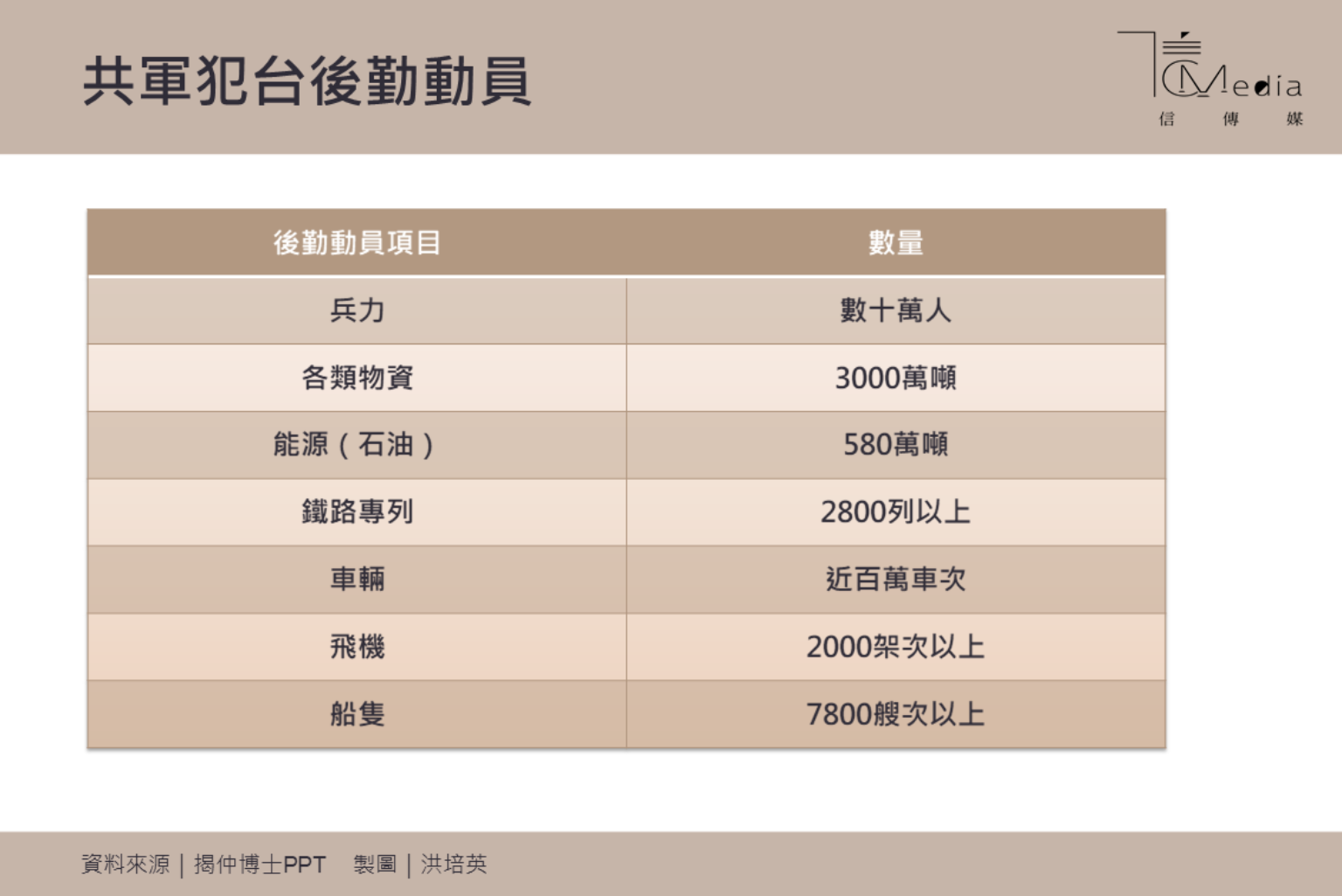 「籌措物資不難,難的是如何短時間內迅速將大量物資及時、精確送到補給點」人員及裝備首先必須抵達東南各省、跨越海峽再運至海上艦隊或陸地部隊,揭仲指出「這是武力犯台作戰最大挑戰」。
