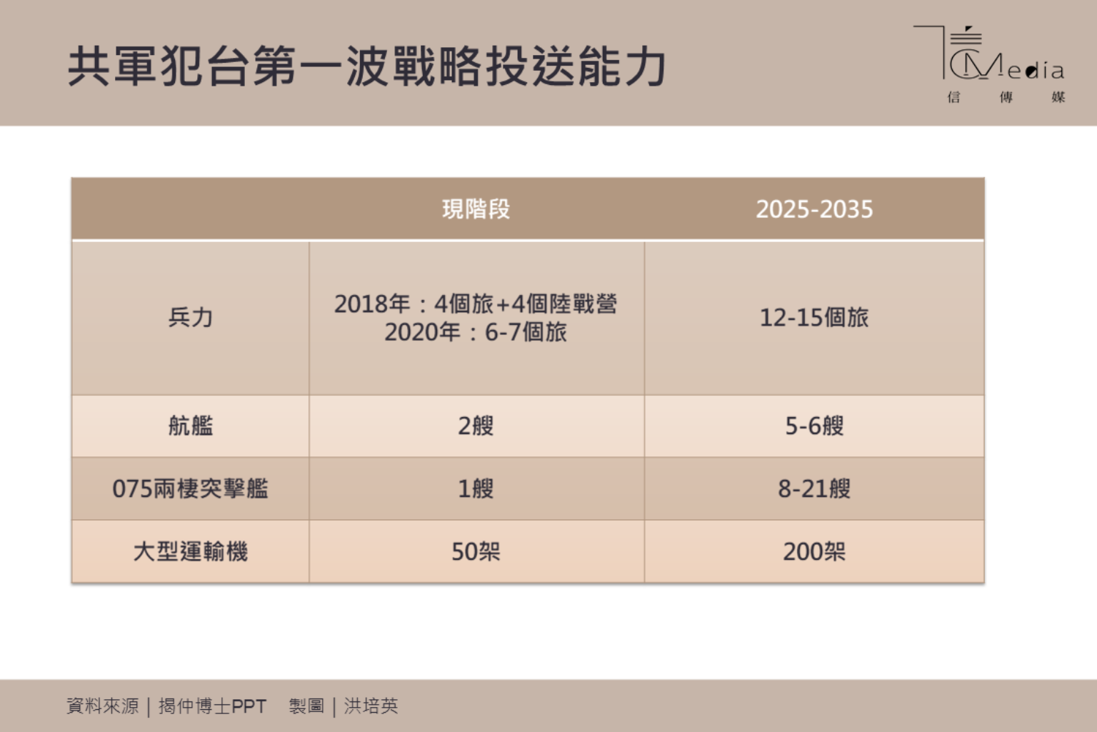 揭仲指出,共軍對國軍實力及國際回應進行綜合評估後以「速戰速決」為目標,致力改革後勤動員、擊殺鏈、戰力投送和登島作戰等方面,這對國軍現行戰略皆會構成重大衝擊。