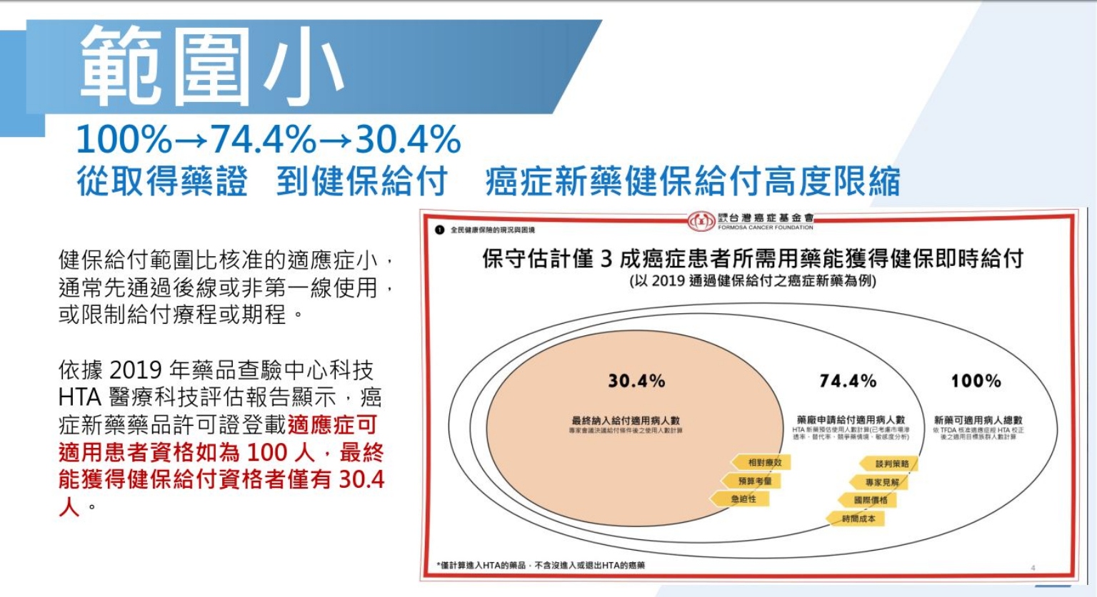 台灣癌症基金會副執行長蔡麗娟指出,根據2013-2020年的資料顯示,癌症新藥從申請健保到給付生效,平均需要730天,而非癌藥為396天,給付速度遠遠落後。「而根據2019年癌症新藥通過健保給付的適用病人涵蓋率則顯示,癌症新藥即便獲得健保給付,給付範圍也嚴格限縮,大概僅涵蓋3成癌友可即時獲得健保給付。」