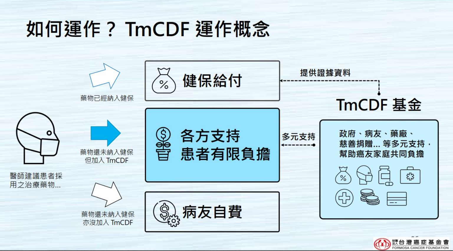 對此,台灣癌症基金會、台灣年輕病友協會與中華民國乳癌病友協會,日前向衛生福利部遞交政策建言書,設立「台灣癌症新藥多元支持基金TmCDF(Taiwan multi-support Cancer Drug Fund, TmCDF)」,作為癌症新藥申請健保生效前的過渡型支持措施。