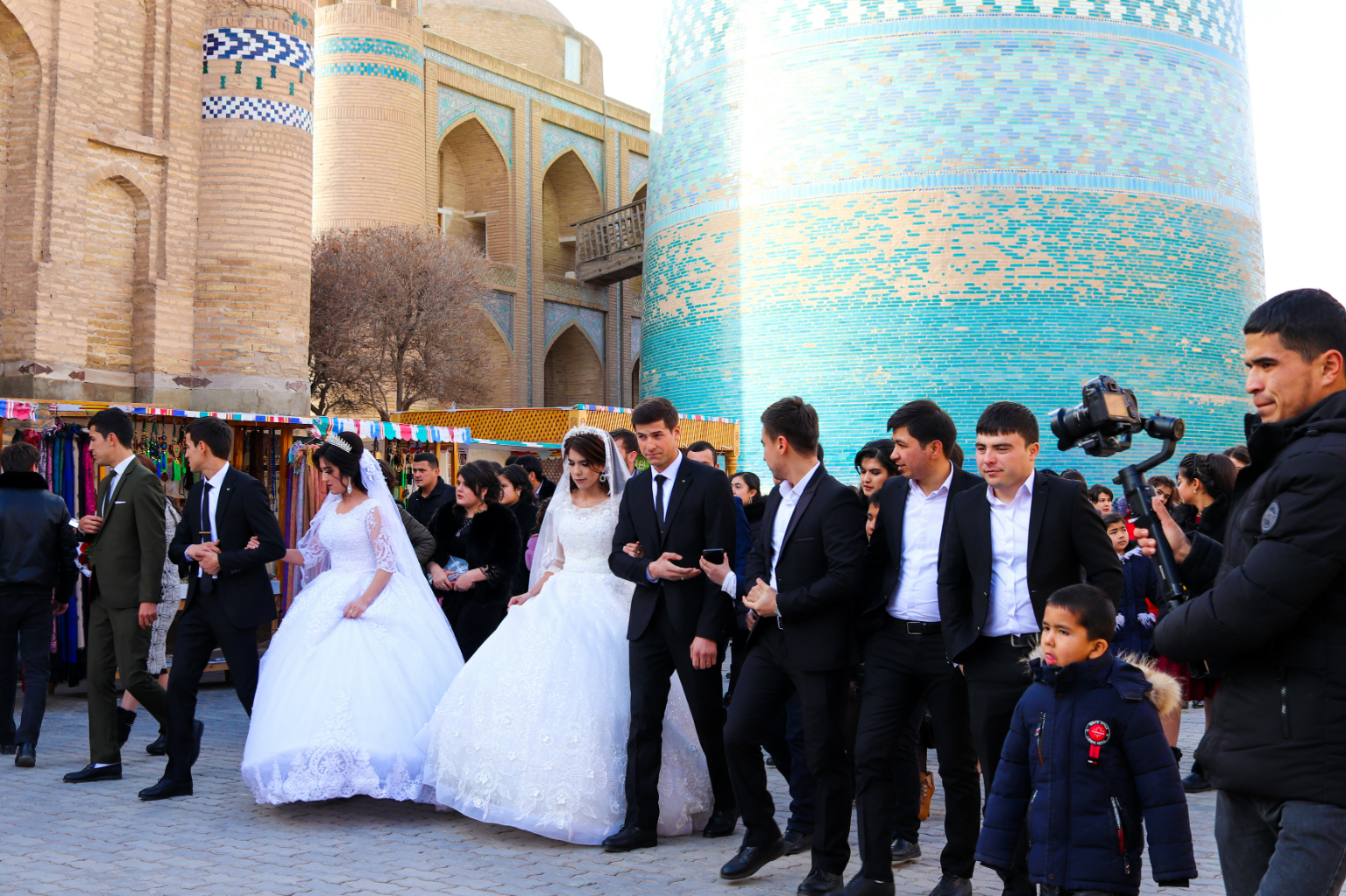 陽光下的土坯建築如單調的黃紙,偶爾由陵墓圓頂或宣禮塔的金藍綠點綴。兩組新人伴隨著龐大的親友團及攝影師在未完工的「短塔」(Kalta-Minor)前合影,新娘穿著西式白紗,蓬鬆的裙襬、頭頂戴著皇冠,像極了公主。