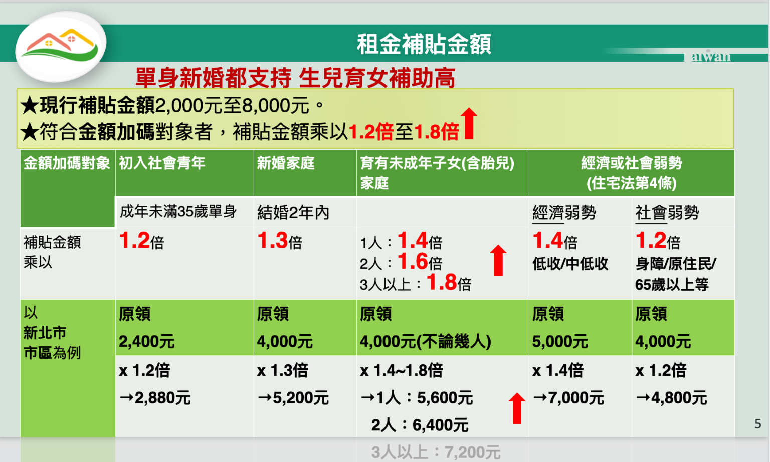 新北市市區補貼金額為例,初入社會青年若成功申請租金補貼,金額原為新台幣2400元,專案加碼則變為2880元,新婚家庭租金補貼原為4000元,未來將變為5200元,育有3名以上未成年子女的家庭,可獲得7200元的租金補貼。