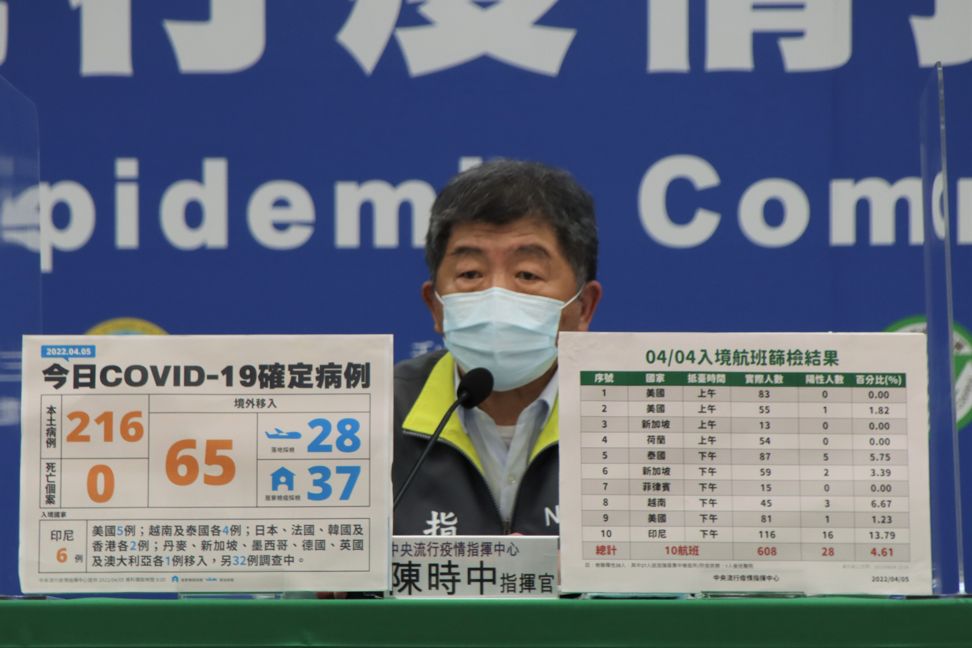 陳時中表示,今日新增之216例本土病例,為100例男性、116例女性,年齡介於未滿5歲至90多歲,發病日介於今(2022)年3月14日至4月4日,其中包含114例為無症狀感染。個案分佈為新北市(91例)、基隆市(33例)、臺北市(28例)、新竹縣(13例)、桃園市(11例)、高雄市及花蓮縣(各10例)、新竹市(8例)、臺中市(5例)、宜蘭縣及彰化縣(各3例)、臺南市(1例)。相關疫情調查持續進行中。