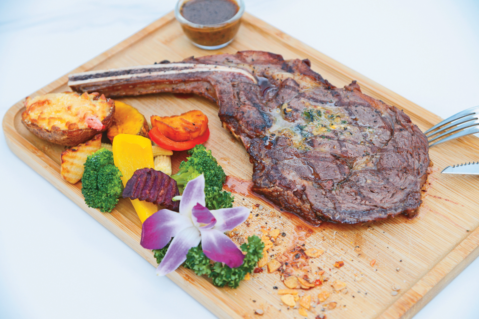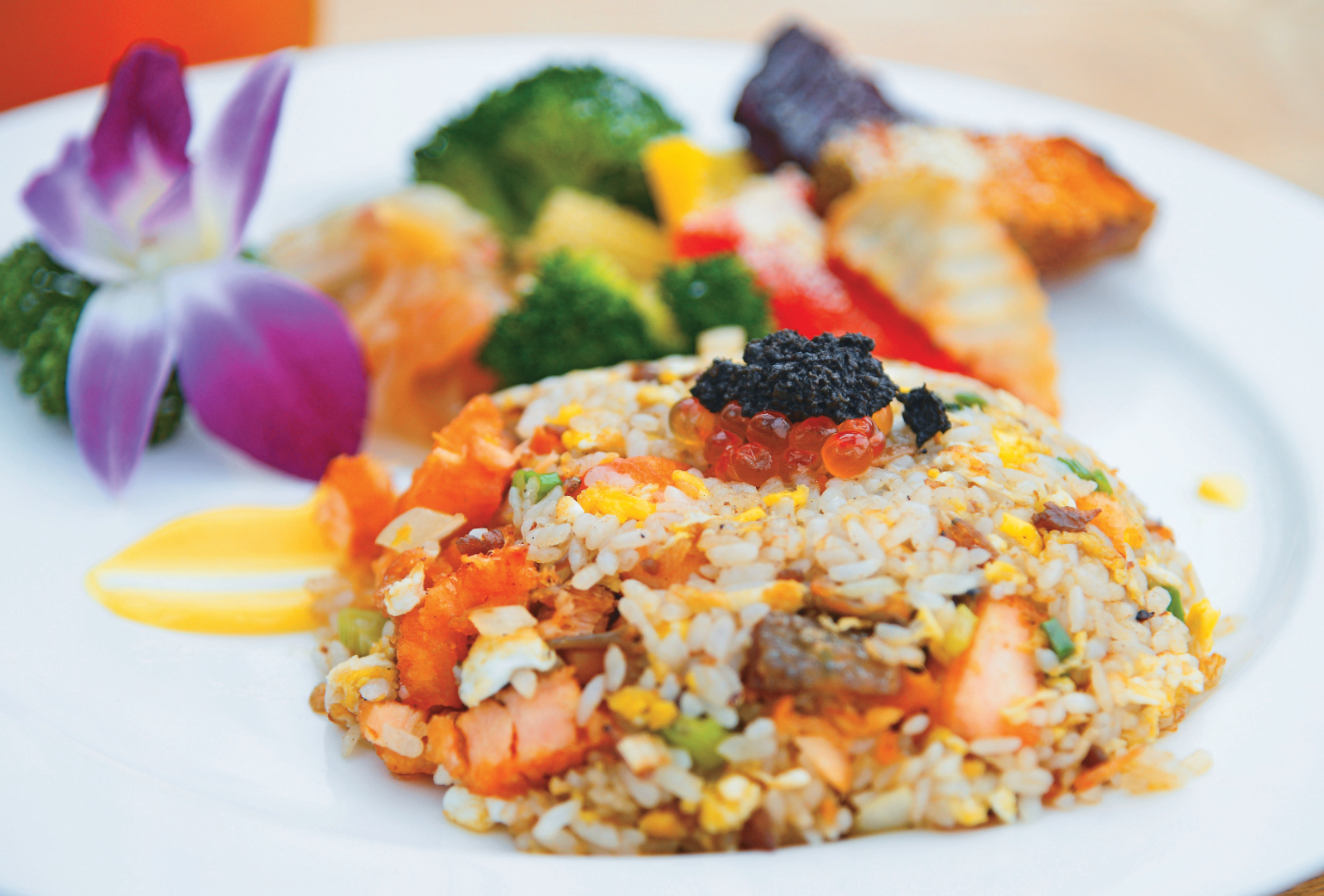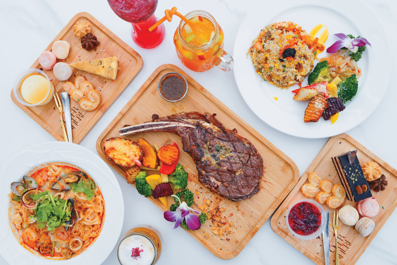 招牌料理「OVERTHER戰斧牛排」選用25盎司的安格斯牛肩頸肉,刷上橄欖油在煎台微炙,鎖住鮮甜肉汁,再送進蒸烤爐,出爐後涮上用香料製成的巴黎卡菲醬,一旁附上巴薩米克醋、黑胡椒粉及紅酒醬汁,讓人品嚐牛肉的香氣及口感。高人氣的「法式松露黃金炒飯」先將挪威鮭魚過油,炸出外酥內嫩的口感,再加入吸飽雞高湯與蒜香精神的米飯拌炒,炒飯粒粒分明,鮭魚香氣滿盈,更以鮭魚卵、松露醬點綴,形成一道海味佳作。