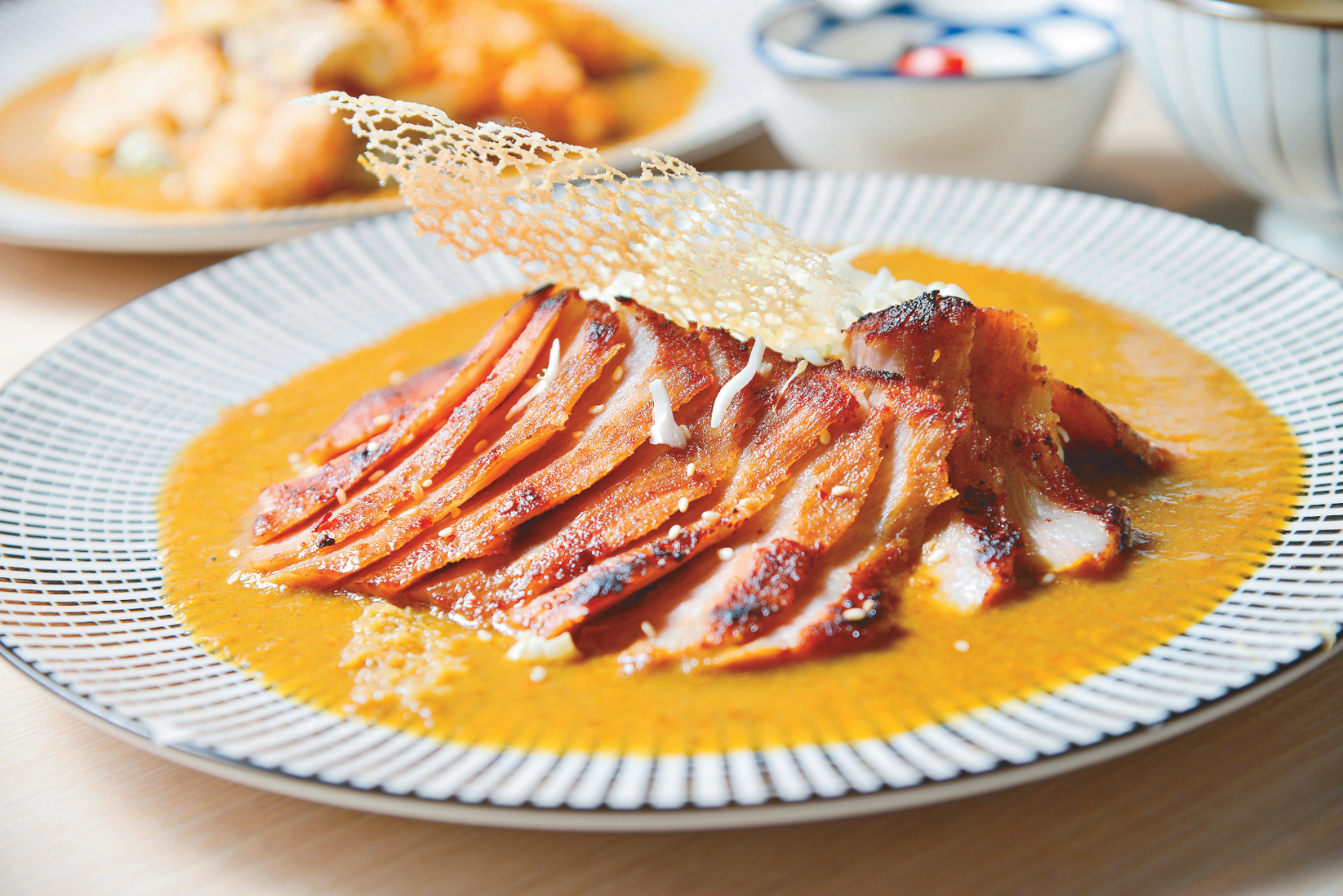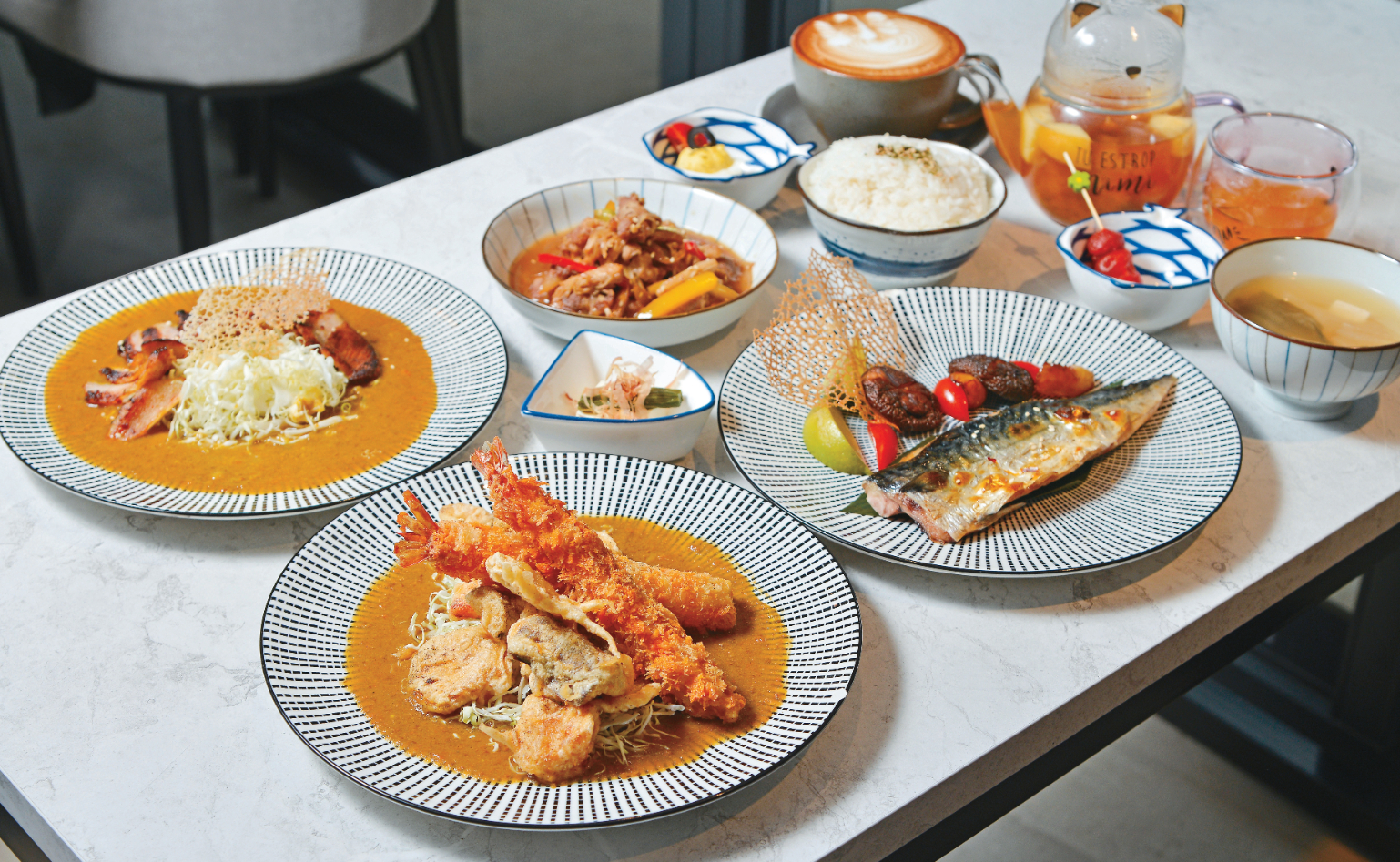 咖哩以定食的方式提供,可依個人喜好選擇主食,每份皆附有紫蘇梅蕃茄、馬鈴薯蛋沙拉、豆腐菠菜佐胡麻醬、白飯及味噌湯。「脆烤麻辣松阪豬」是人氣口味,以自家調製的麻辣醬汁醃漬松阪豬,烤皮脆肉嫩的口感,濃郁風味與溫和咖哩達到巧妙平衡又豐富層次;「酥炸天婦羅炸蝦」將白蝦、茄子、甜椒裹上麵衣,一口咬下的外酥內軟,沾附咖哩醬汁更突顯食材鮮美。