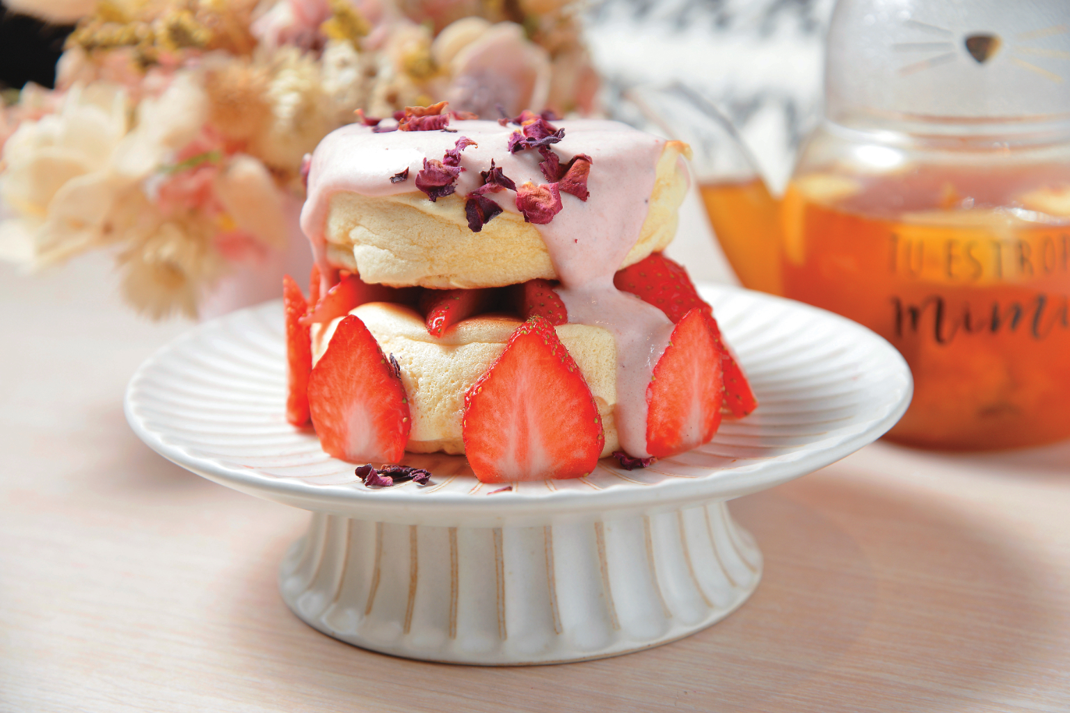 季節限定的「草莓舒芙蕾」先以新鮮草莓、上白糖製成草莓醬,再拌入鮮奶油成為色澤粉紅、口感滑順的草莓奶醬,淋在熱呼呼剛起鍋的舒芙蕾上頭,綴以乾燥玫瑰花瓣裝飾。此時,佐一杯特選配方豆的「貓禾拿鐵」,咖啡豆的花香、焦糖、可可風味融入滑順奶泡;或是來一壺鮮果自製的「玫瑰花語水果茶」,在享用美味之餘,邊欣賞乳姑山美景,邊感受貓咪的療癒。