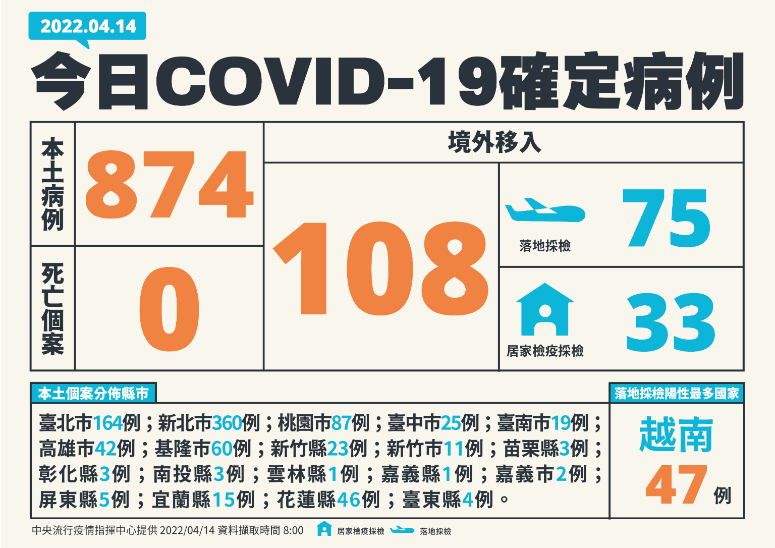 指揮中心指揮官陳時中表示,今日新增之874例本土病例,為450例男性、423例女性、1例調查中,年齡介於未滿5歲至100多歲,發病日介於今(2022)年4月2日至4月14日,其中包含467例為無症狀感染。