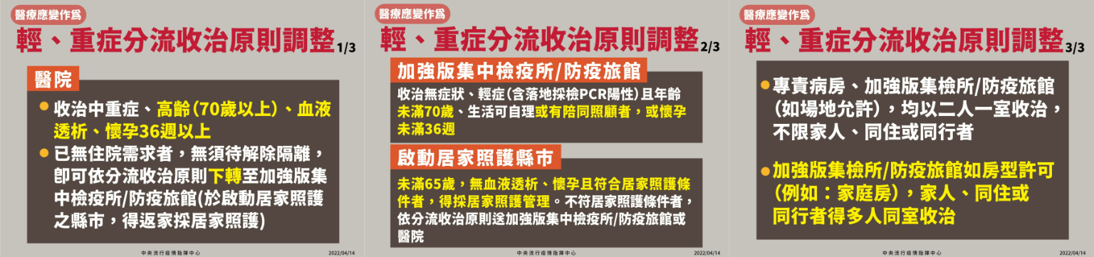 鑒於近期本土疫情升溫,面對Omicron病毒株以輕症及無症狀為主的快速傳播模式,指揮中心今日表示,為擴大醫療應變量能,強化輕重症分流,以確保醫療量能及確定病例即時獲得醫療照護,即日起調整COVID-19確定病例輕重症分流收治條件,說明如下: