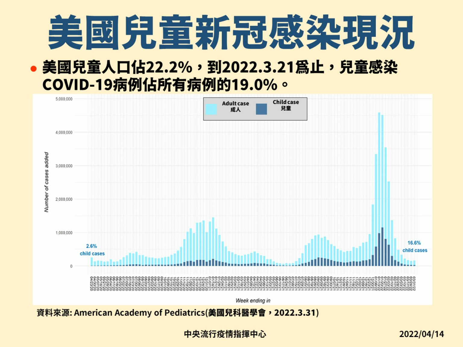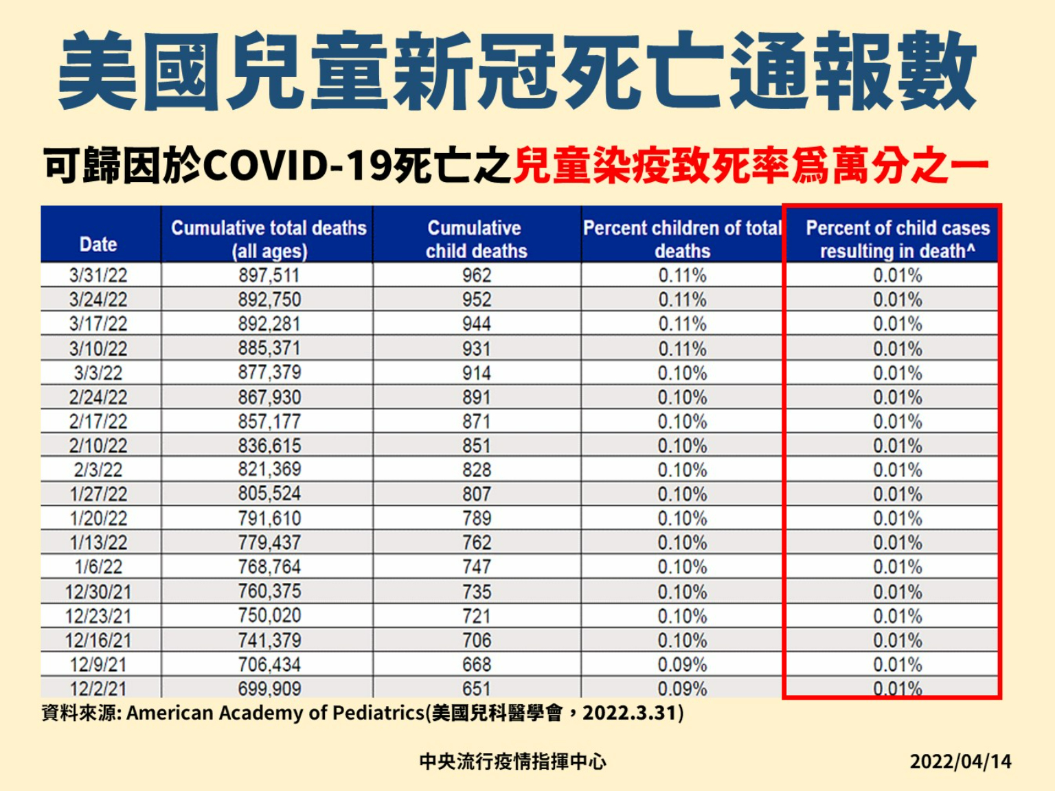 李秉穎引用美國資料進一步分析,兒童佔美國人口比為22.2%,染疫兒童病例佔所有病例19%,可見疫情擴散、防疫規定鬆綁後,兒童被感染的數量還是會非常可觀,而確診兒童數目增加後,可以預見就會開始出現死亡病例。