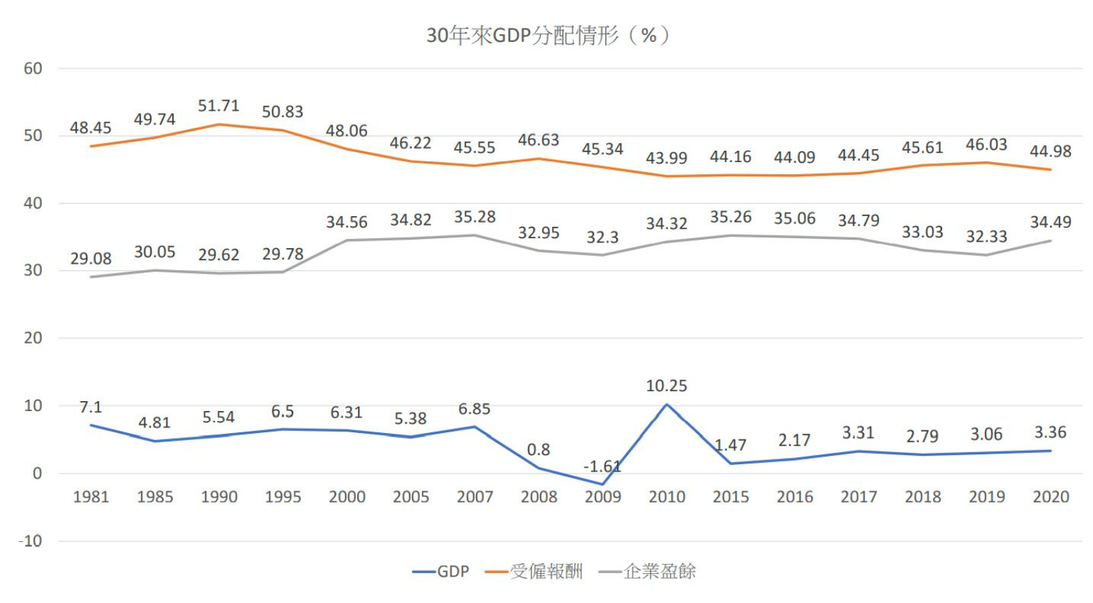 受雇人員報酬就是薪資,從1981年到現在30年來呈現長期向下,只有1981年到1990年台灣經濟奇蹟,勞工的薪資往上升,1990年到2000年中國改革開放,台商到大陸投資,台商的獲利是因為中國低廉的人力跟物力,可是因為台商的工廠到大陸去了,勞工的需求不在台灣,所以台灣的勞工就比較辛苦了;2000年到2008年中國加入WTO,大國開始崛起,對大陸的投資又增加了,勞工的薪水就越來越少;2008年發生金融海嘯,但因為當時有發消費券,受雇薪酬占GPD比重有微幅上升;2016年川普當選之後就開始美中貿易大戰。