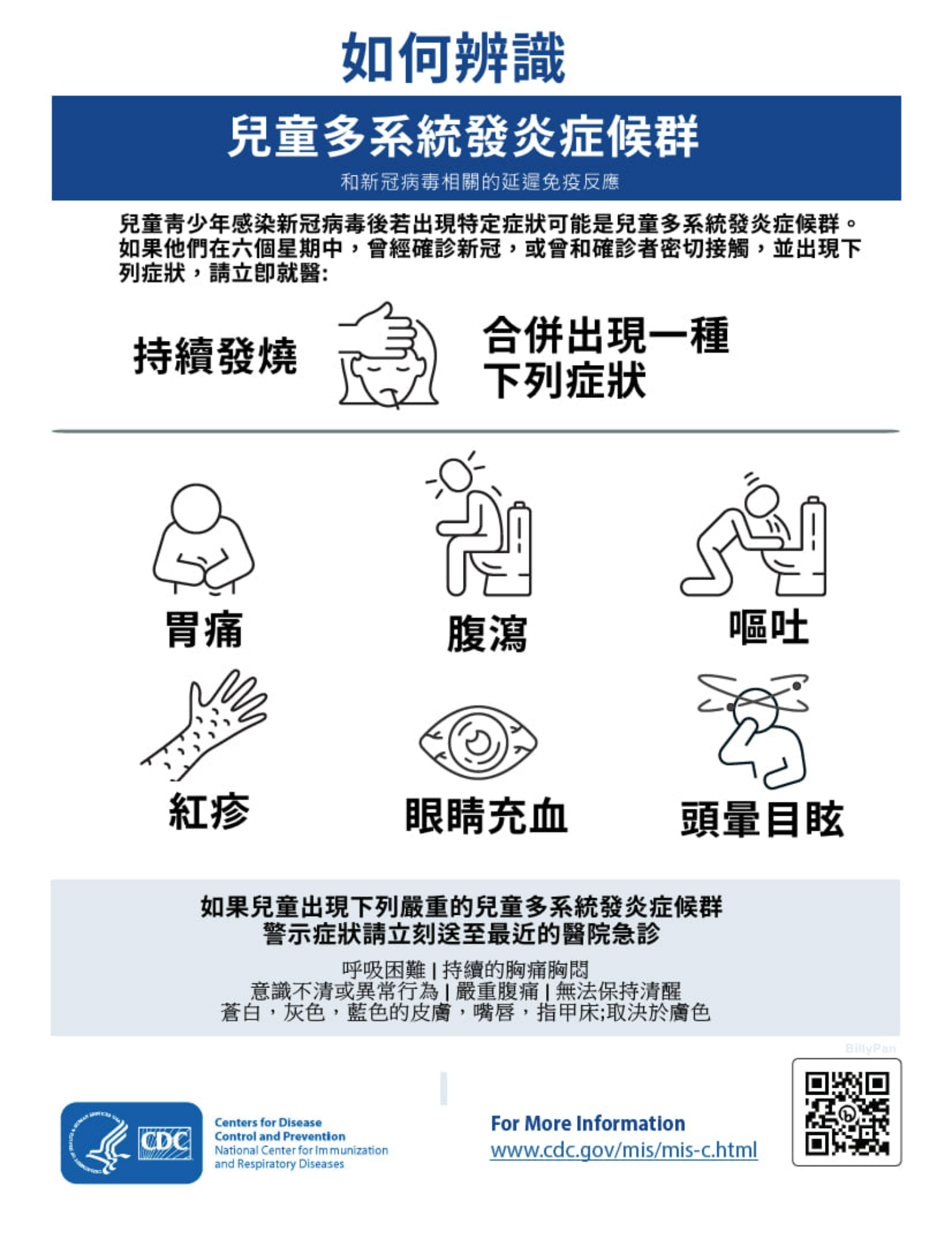 美國CDC網頁有張衛教單非常清楚,告訴家長在兒童青少年染疫後,出現哪些症狀就必須帶小孩去看醫生,甚至某些警示症狀要立刻送急診。我把這張衛教單翻成繁體中文如附圖,歡迎大家自由取用。
