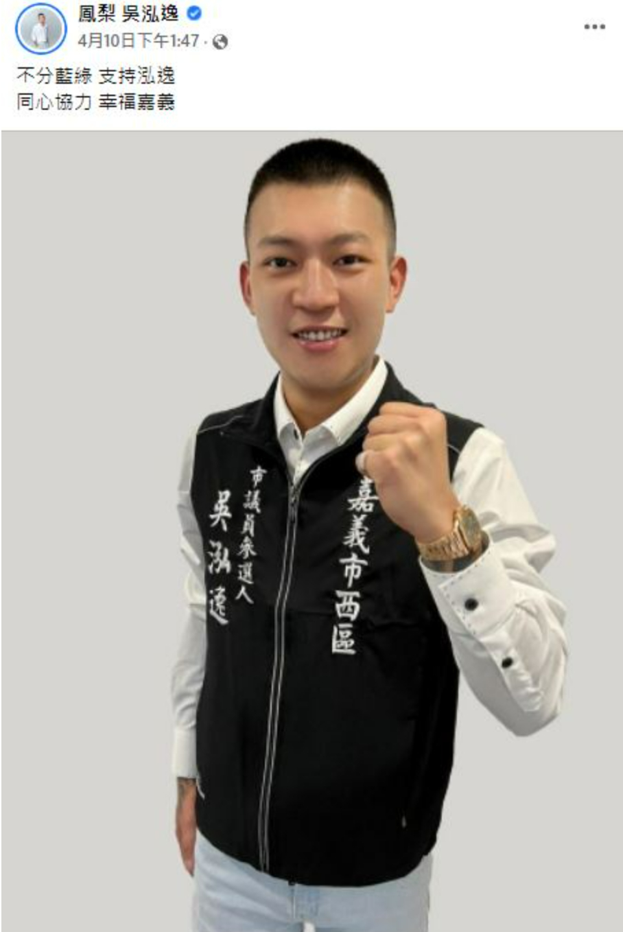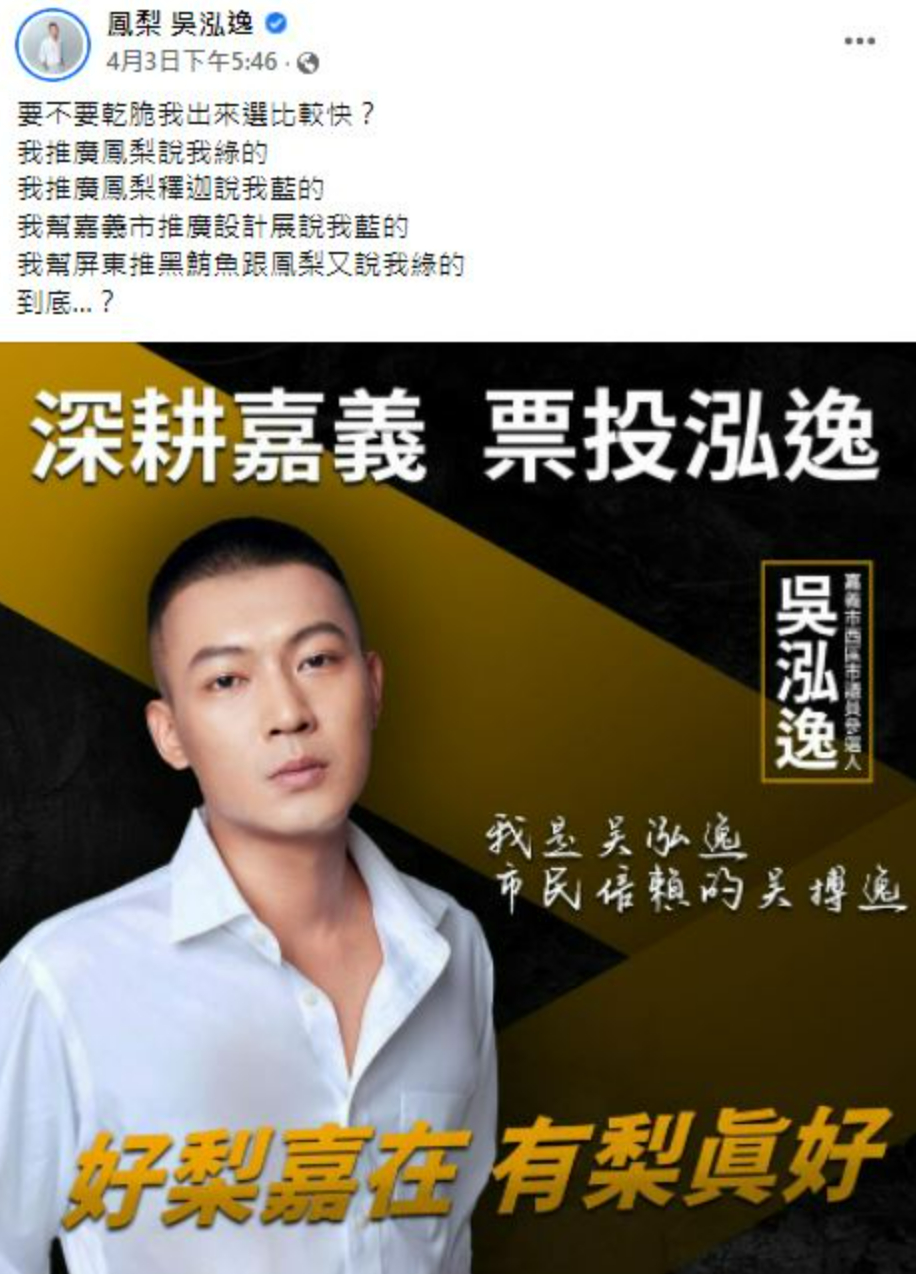 隔週鳳梨吳泓毅又在臉書貼出身穿競選背心,並寫出16字競選口號「不分藍綠,支持泓逸,同心協力,幸福嘉義」表明參選嘉義市西區市議員。
