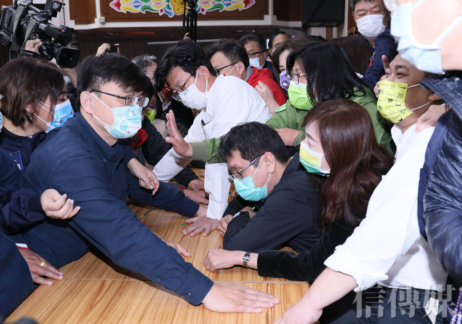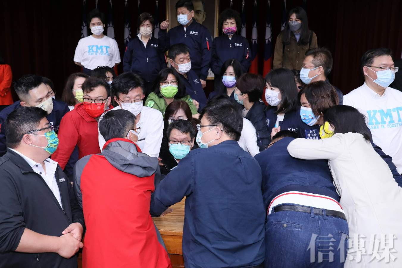 藍綠發動人海戰術誰也不讓誰,國民黨總召曾銘宗會前就表示,現在疫情嚴峻,結果民進黨在這時候提出此案,讓立委們群聚,如果真的有人染疫,立院恐要關門,但藍綠立委們還是包圍主席台,藍委高喊「全民防疫,散會!」