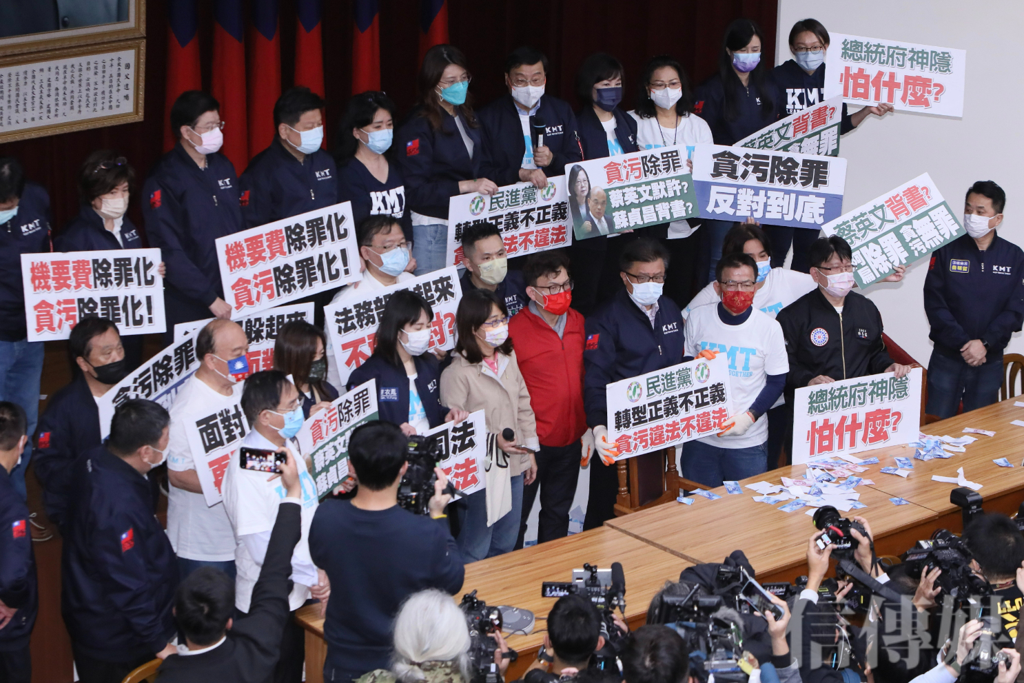 立法院財政委員會今(21)日審查攸關國務機要費除罪化的會計法草案,國民黨團質疑是要替前總統陳水扁解套,民進黨則要強勢過關;綠營立委連夜輪班守在委員會門口,更發布早上6點黨團甲級動員令,6點半委員會大門一開,綠委就成功占領主席台,主席台及麥克風被民進黨眾立委團團保護。