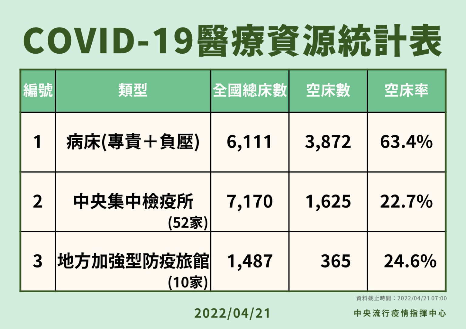 指揮中心指揮官陳時中表示,今日新增之2,969例本土病例,為1,458例男性、1,510例女性、1例調查中,年齡介於未滿5歲至90多歲,發病日介於今(2022)年3月13日至4月21日,其中包含1,549例為無症狀感染。個案分佈為新北市(1,000例),臺北市(663例),桃園市(414例),基隆市(216例),臺中市(139例),花蓮縣(92例),高雄市(82例),宜蘭縣(80例),雲林縣(42例),新竹縣(38例),彰化縣(37例),新竹市及臺南市(各34例),屏東縣(32例),臺東縣(22例),苗栗縣(19例),南投縣(10例),嘉義市(6例),嘉義縣(5例),澎湖縣及連江縣(各2例)。相關疫情調查持續進行中。