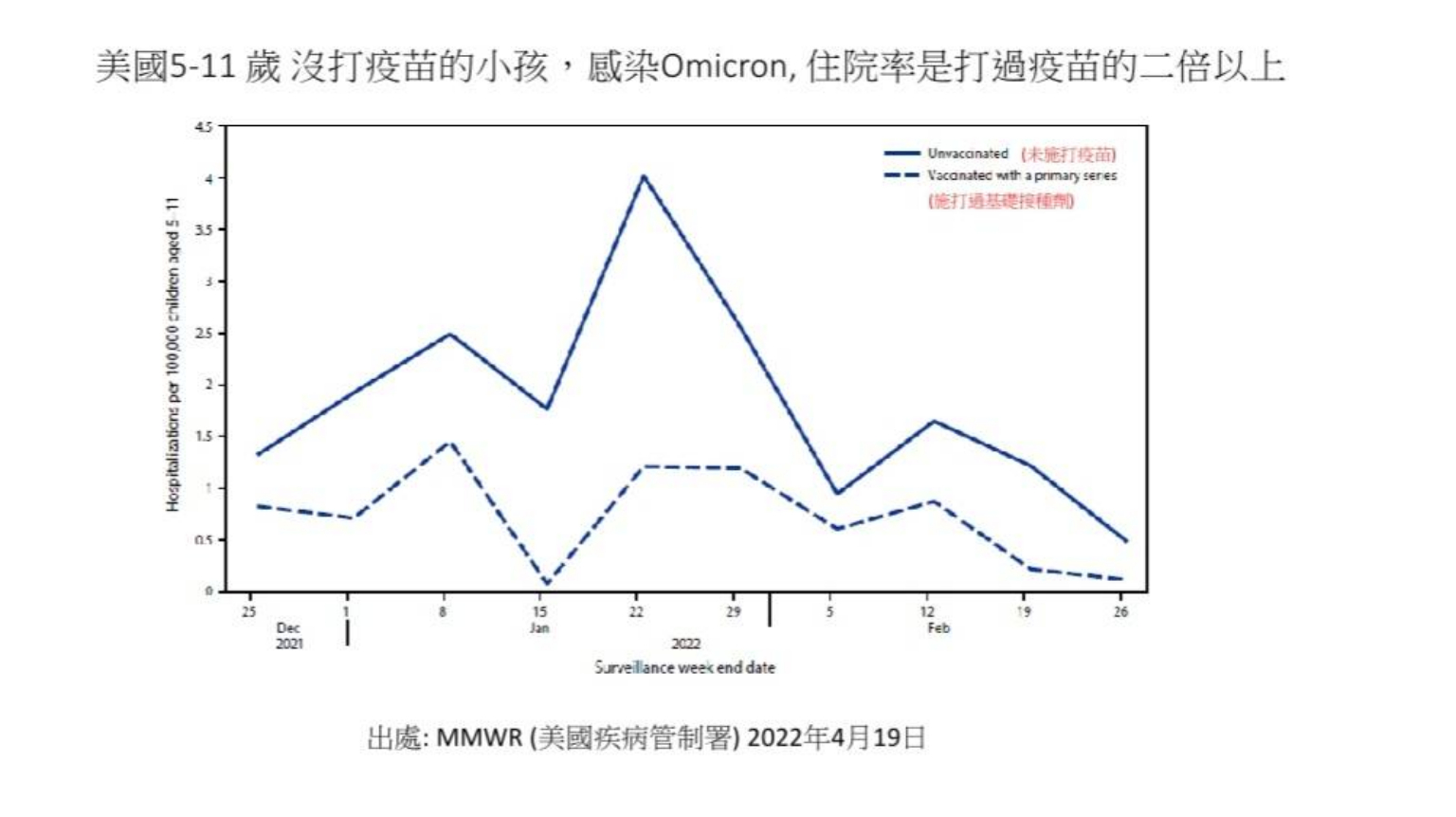 她也提到,所有人均可能染上新冠肺炎,「儘管新冠肺炎對成人來說更加危險,但也有兒童因新冠肺炎導致重病和死亡,美國5-11歲沒打疫苗的小孩,感染Omicron,住院率是打過疫苗的2倍以上(如圖),大量兒童病患的出現也可能會癱瘓醫療系統,接種疫苗能讓兒童更安全地上課、參與課後活動和運動,以及與朋友互動。且兒童被病毒感染常扮演傳播者的角色,讓兒童接種疫苗還有利保護重症風險更高的祖父母和患有基礎疾病的其他家人。」
