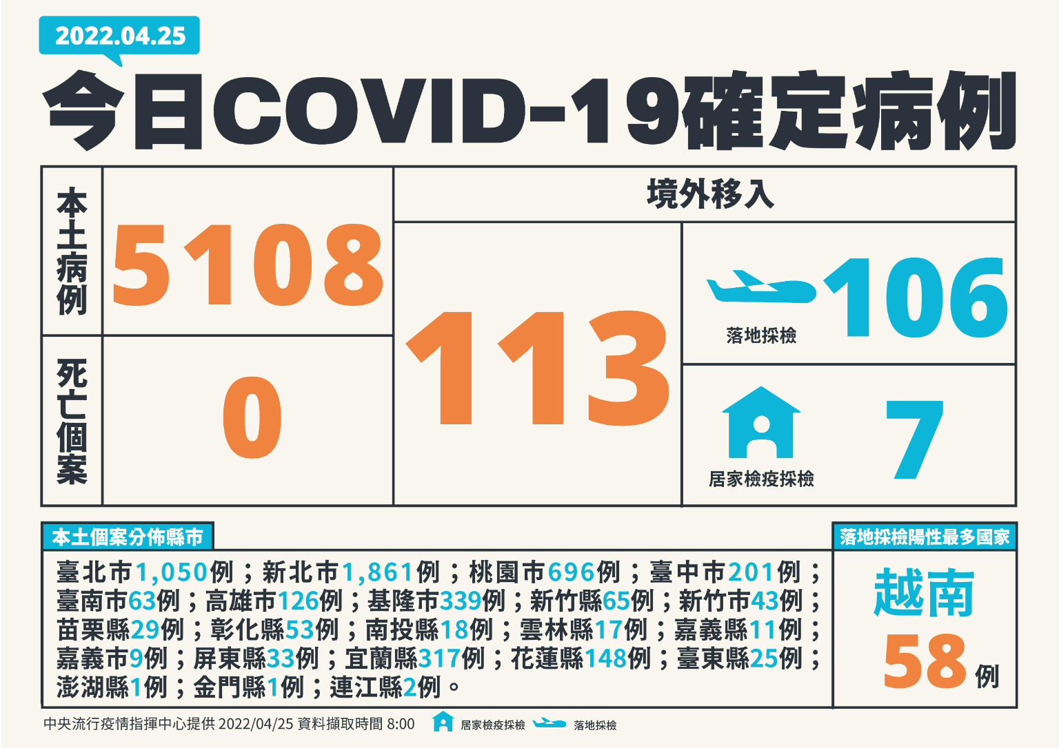 中央流行疫情指揮中心今(25)日公布國內新增5,221例COVID-19確定病例,分別為5,108例本土個案及113例境外移入(106例為航班落地採檢陽性);另確診個案無新增死亡。