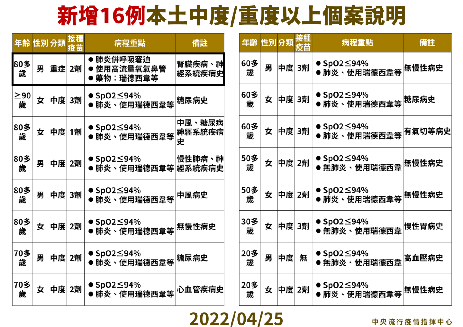 16例中重症當中有13例是50歲以上的確診者,今天的中重症確診者中,僅1例是沒打疫苗,施打一劑疫苗為1例,施打兩劑疫苗有8例,施打三劑疫苗為6例,中重症確診者創下單日新高紀錄。