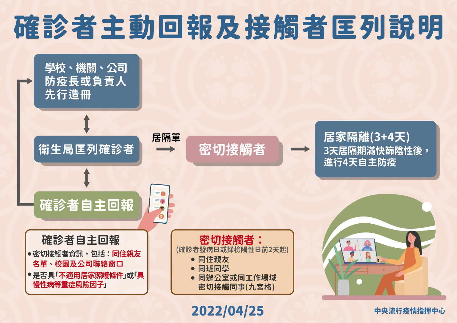 (四)設置「確診個案自主回報疫調系統」:確診者收到連結網址(透過法定傳染病通報系統發送),登入後填寫上述同住親友及校方、公司、機關(構)之防疫長或其主管的姓名、住址、電話、電郵等可供聯繫之資料,再由系統發送通知書給同住親友,另通知校方、公司、機關(構)之防疫長或其主管請其匡列學校/職場之接觸者並回傳名冊,提供給衛生局開立電子居隔單以供作請假、保險、相關補助申請之依據。