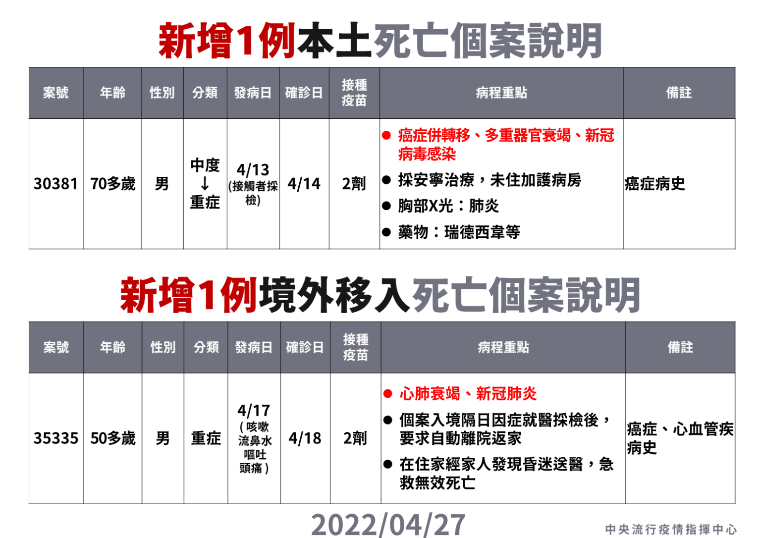 案30381為本土病例,4月13日進行接觸者採檢,於今年4月14日確診,具癌症病史,屬重度感染個案,採安寧治療,未住加護病房,於4月20日死亡。